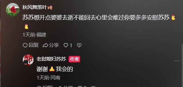 有善良的网友让苏苏想开点,毕竟人死不能复生,也让大哥多多安慰苏苏,大哥则是回复“谢谢,我会的”。