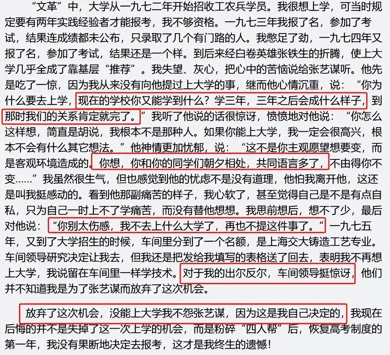 “我和张艺谋的友谊与爱情,从一九六五年学生时代开始,到一九八七年,整整二十二个年头。然而,这保持了二十二个年头的友谊和爱情却抵挡不住一瞬间骤起的风暴。”