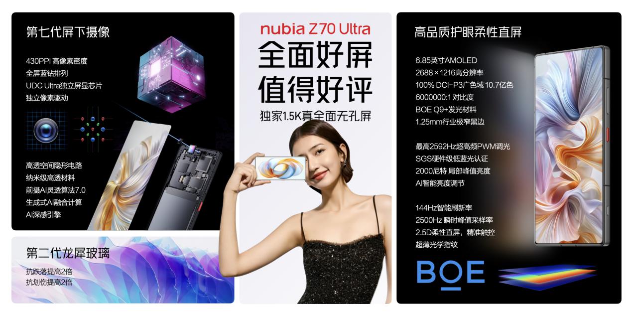 作为真全面屏旗舰迭代之作,努比亚Z70 Ultra屏幕显示和自拍体验实现突破性升级。新机搭载全球首款1.5K真全面无孔屏,主显示区与屏下区域均实现430 PPI的超高像素密度,采用全屏蓝钻排列,144Hz全屏刷新率,2000尼特局部峰值亮度,强光下内容依旧清晰,FIAA极致压缩走线技术实现95.3%的超高屏占比,加上内置UDC Ultra独立屏显芯片,屏幕显示实现像素级优化。