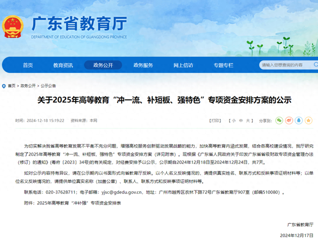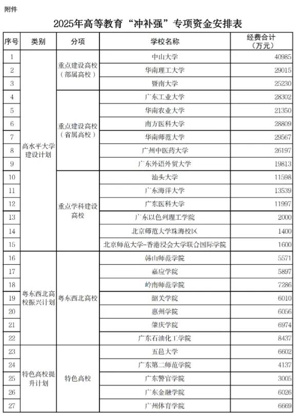 近日,广东省教育厅公示了2025年高等教育“冲一流、补短板、强特色”专项资金安排方案。