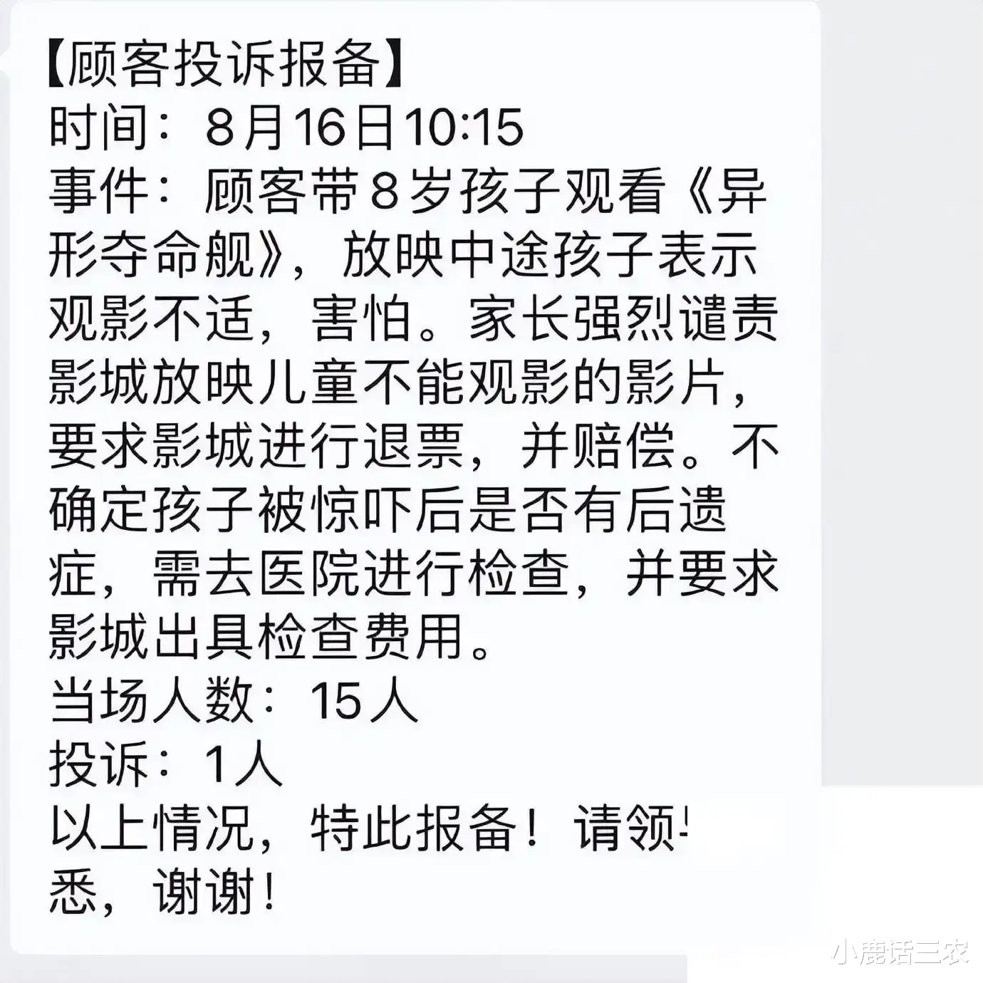 面对这样的情况,很多人都对这位家长提出了批评,认为其在观影选择上存在着一定的问题。作为一部R级限制片,《异形夺命舰》的影片内容可能会相对暴力或恐怖,而在进行观影选择时,家长就应该对影片的内容有所了解,并根据孩子的实际情况来进行选择,而非盲目跟风。