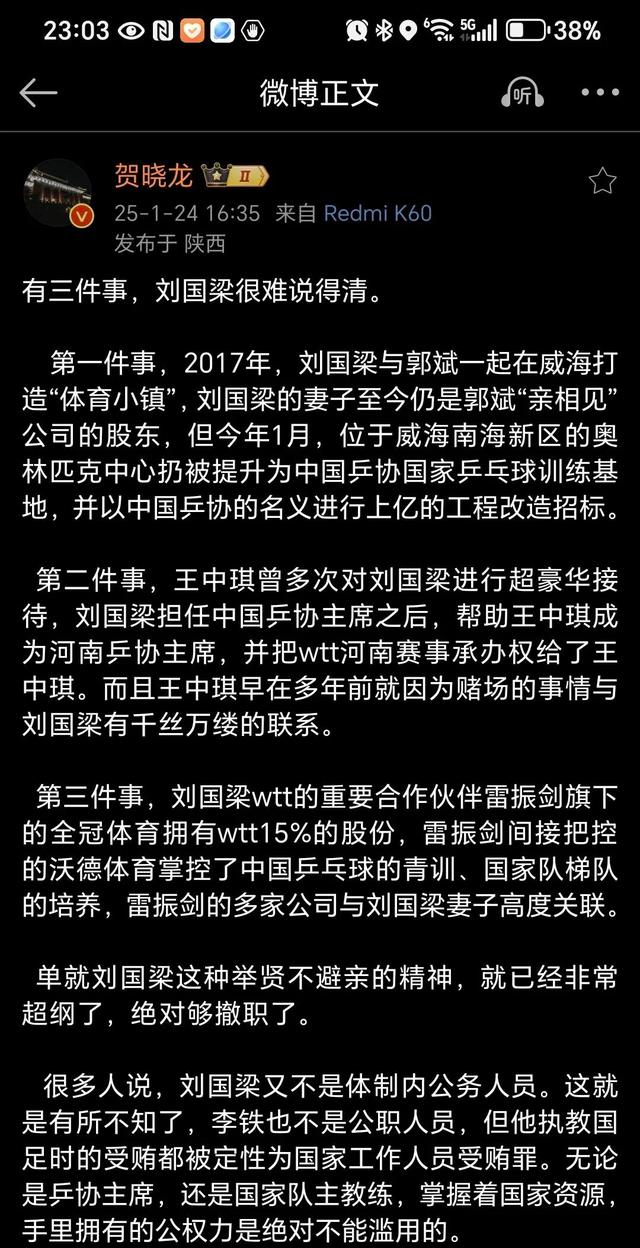 在贺晓龙的观点中,刘国梁有三方面的问题是无法解释清楚的。