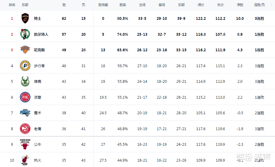 尼克斯121-105大胜老鹰,雄鹿则是加时121-115险胜热火,字母哥轰下36+15+10大号三双,引领雄鹿连续9年晋级季后赛。如此一来,东部前六直通季后赛名额球队全部确定: