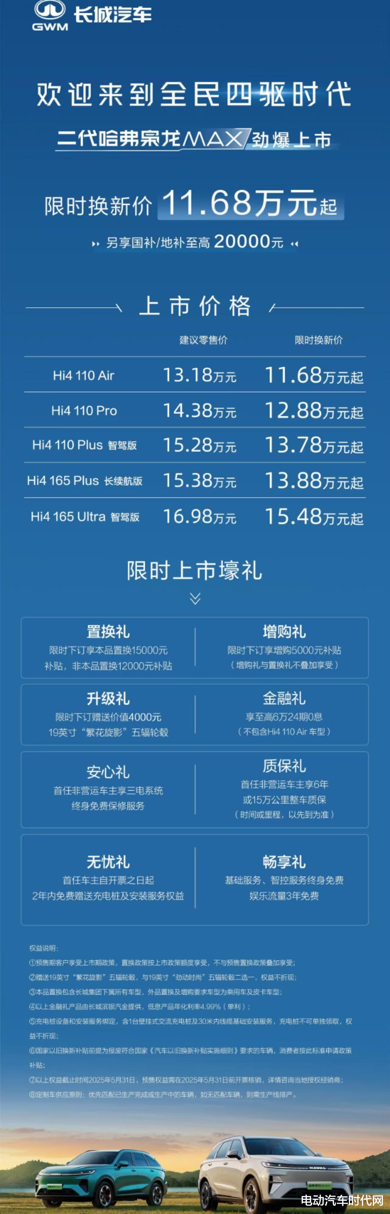 同时,二代哈弗枭龙MAX也已正式上市,官方指导价13.18-16.98万元,在5月31日前可享受限时换新价11.68万元-15.48万元,另享国补/地补至高20000元,一并公布的还有8重限时上市壕礼,包含置换礼、增购礼、升级礼、金融礼、安心礼、质保礼、无忧礼、畅享礼。