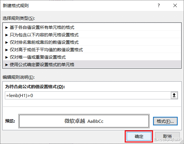 lenb 表示字节长度,公式的意思是只要单元格中的字节长度 >0,即不是空单元格,就触发条件;