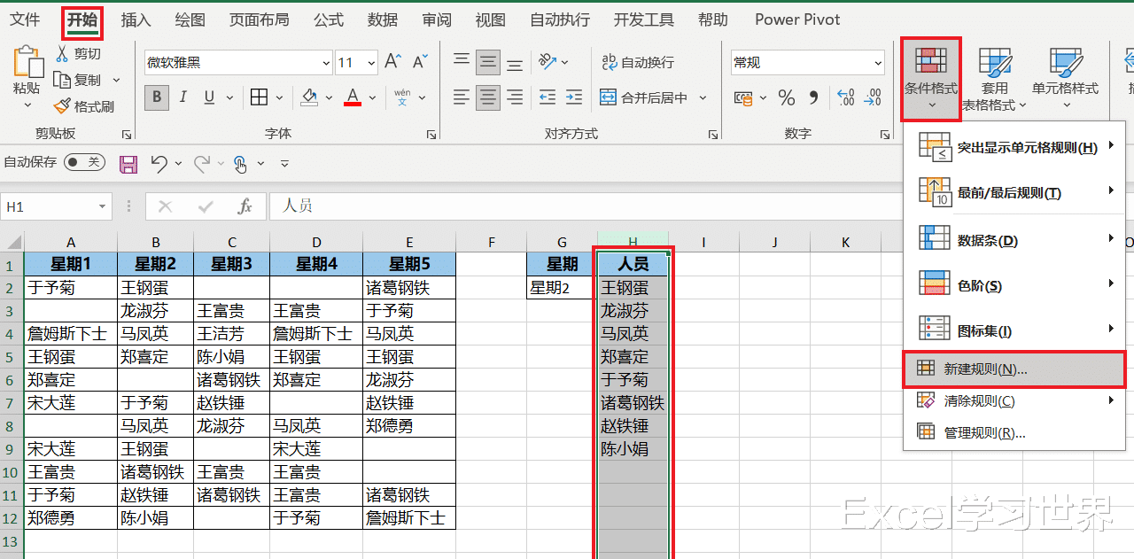 4. 选中 H 列 --> 选择工具栏的“开始”-->“条件格式”-->“新建规则”