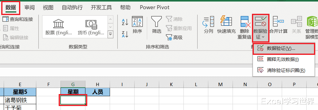 1. 选中 G2 单元格 --> 选择工具栏的“数据”-->“数据验证”-->“数据验证”