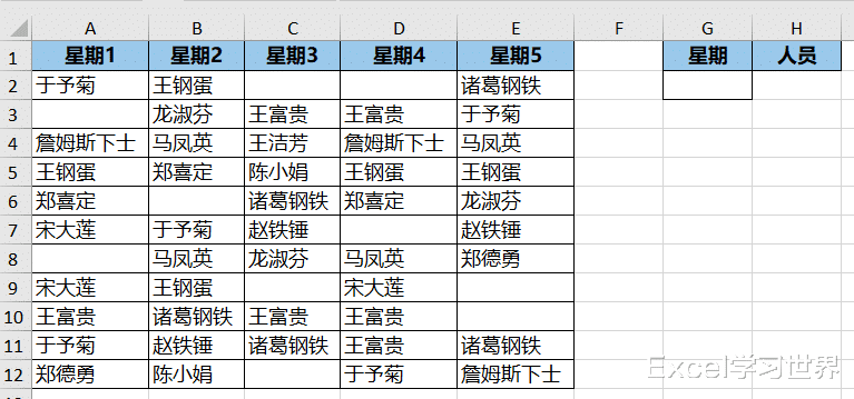 选择星期后,显示出对应的所有人名,要求去重和去除多余的空行;