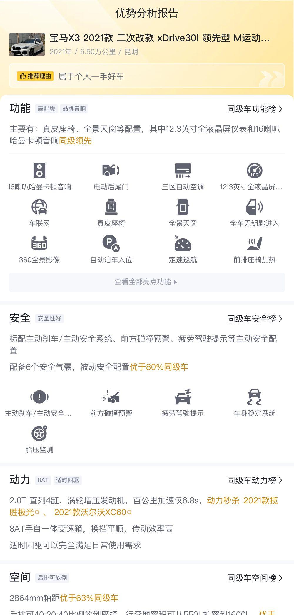 这款车的配置,尽管属于领先型M运动套装,但也需要与同年度同配置的竞品进行比较,才能判断其性价比。一些配置是标配还是选配,这同样影响车价。如果一些重要的配置缺失,那么实际车价也要相应降低。