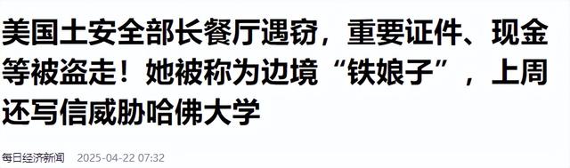 每日经济新闻2025.4.22——《美国土安全部长餐厅遇窃,重要证件、现金等被盗走!她被称为边境“铁娘子”,上周还写信威胁哈佛大学》
