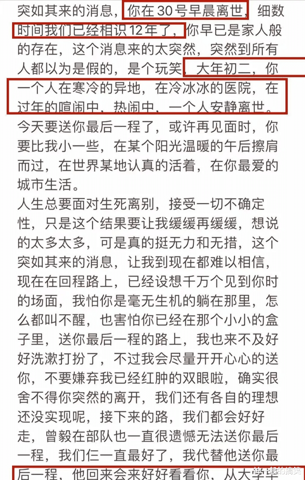 别让遗憾重演。趁阳光正好,该回家的回家,该体检的体检。生命的警钟已经敲响,请好好爱惜自己。他的微博停留在岁末年初,充满对未来的期待。谁知下一秒,竟成永别。这个世界少了一个演员,一颗星星陨落了。愿天堂没有病痛,愿来生不再孤单。今夜抬头看星空,也许那颗最亮的星星,就是他温柔的微笑。珍惜当下,热爱生活。这是他用生命换来的箴言。