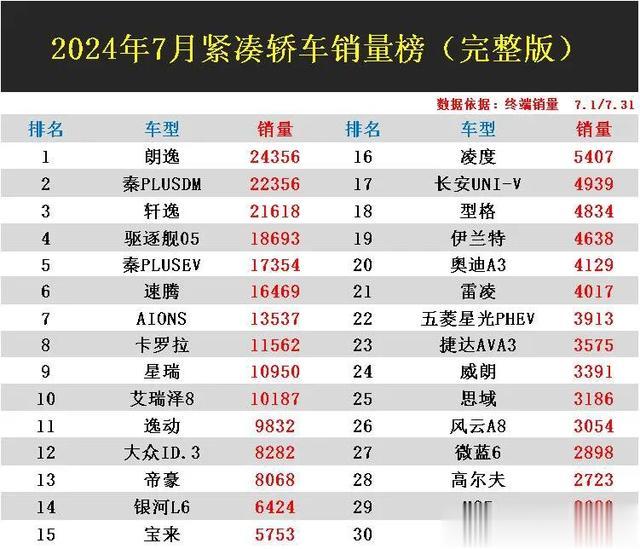 具体来看各车型详细销量,朗逸以2.4万辆的成绩拿下7月份销量冠军宝座,秦PLUSDM,轩逸紧随其后,销量均达2万辆,表现都很亮眼。依次是,驱逐舰05,速腾,AIONS,卡罗拉,星瑞,艾瑞泽8都10000+辆,逸动,大众ID.3,帝豪,凌渡,型格,伊兰特,奥迪A3,均在4000-9000辆之间,威朗,思域,风云A8,高尔夫,MG5,科鲁泽,表现比较中规中矩,均名列榜单前30。