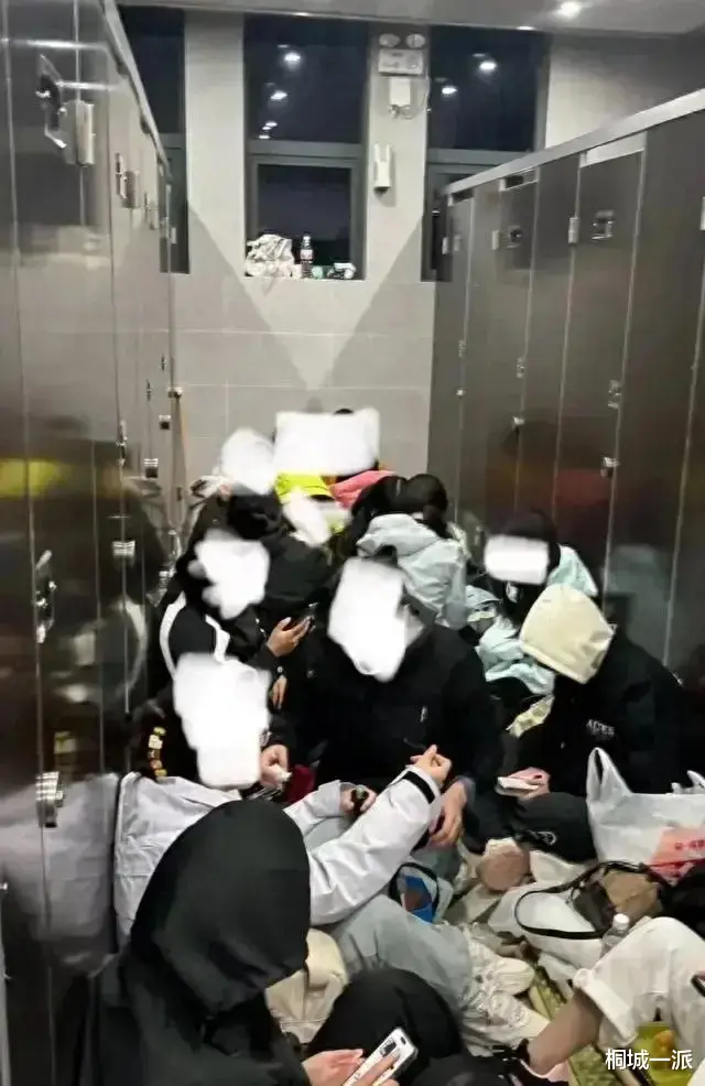 在狭窄的厕所过道,挤满了10多个游客,或躺或坐,有的还在悠闲地玩手机刷抖音,看这架势,想必就这么对付着,准备在厕所一夜到天明吧。