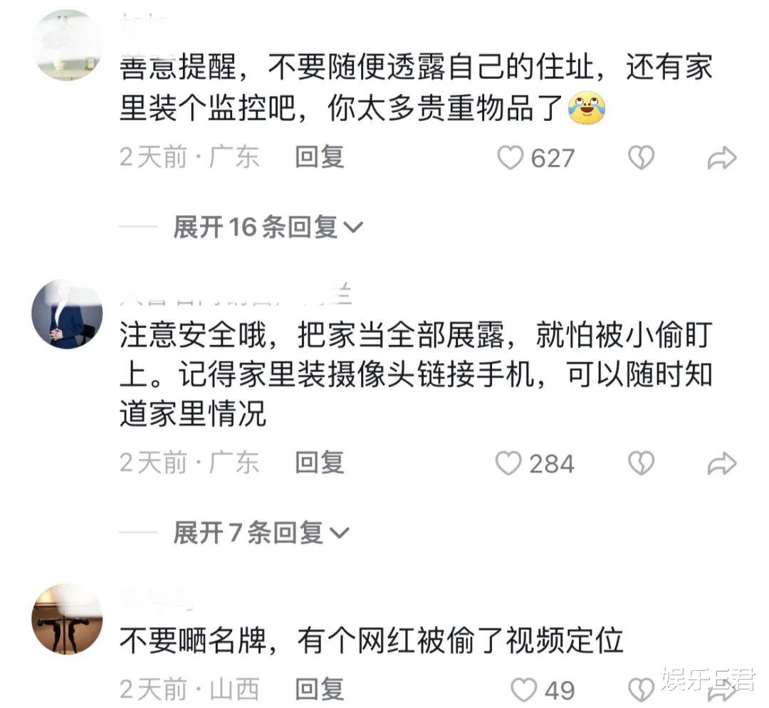 看到庄思敏活得这么潇洒,不少网友都表示羡慕,觉得她很有气质。不过,她高调炫富的行为也引起网友担忧,有人提醒她慎防小偷入屋,“善意提醒,不要随便透露自己的住址,还有家里装个监控吧,你太多贵重物品了”、“注意安全喔,把家当全部展露,就怕被小偷盯上。记得家里装摄像头连接手机,可以随时知道家里情况”。