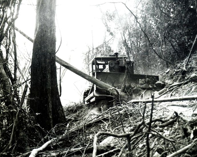 必须砍伐大量的树木,清理大量树根,在工程机械缺乏的情况下,只有用锄头铁锹刨了。 逢山时,用炸药把山石炸松,再用铁锹和锄头把土扒平,运 送石料灰浆的常用工具就是小推车。