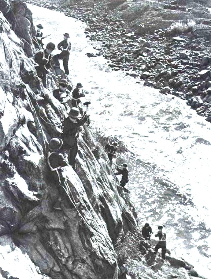 遇河架桥,我工程兵为老挝建造的楠乌江大桥,是老挝当时最好的公路桥。图为援老抗美工程兵在老挝修建公路的照片。