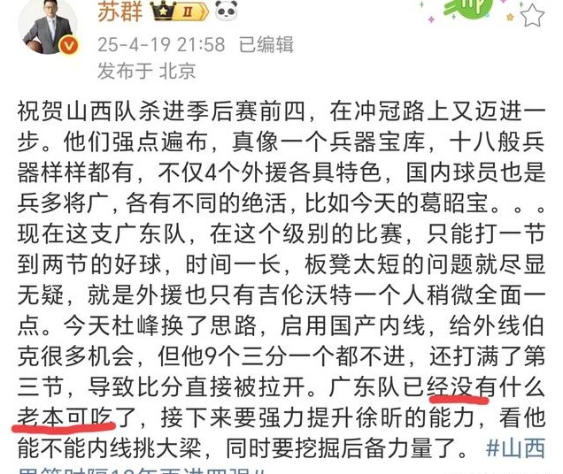 值得一提的是,在最后,苏群谈到“没有老本可吃”六字来总结广东队接下来的处境,除了要换外援外,任骏飞、徐昕、张文逸、黄荣奇共4名球员的合同全部到期。而目前的广东队阵容显然需要大修。