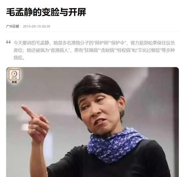 在媒体镜头前,毛孟静义正词严地指责警方“滥用武力”,为那些违法乱纪分子张目,当暴力愈演愈烈,局势几近失控之时,毛孟静却悄悄选择了明哲保身。