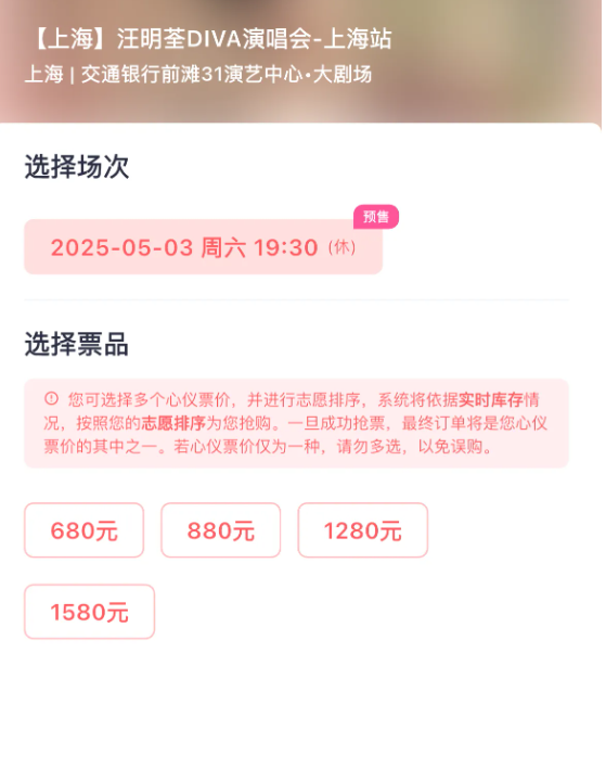 这场演唱会定在5月3号,地点是交通银行前滩31演艺中心·大剧场,票价分了1580元、1280元、880元和680元这四档。按说开票都好几天了,可实际情况呢?大麦网上除了最便宜的680元那档票卖完了,其他价位的票还剩一大堆。