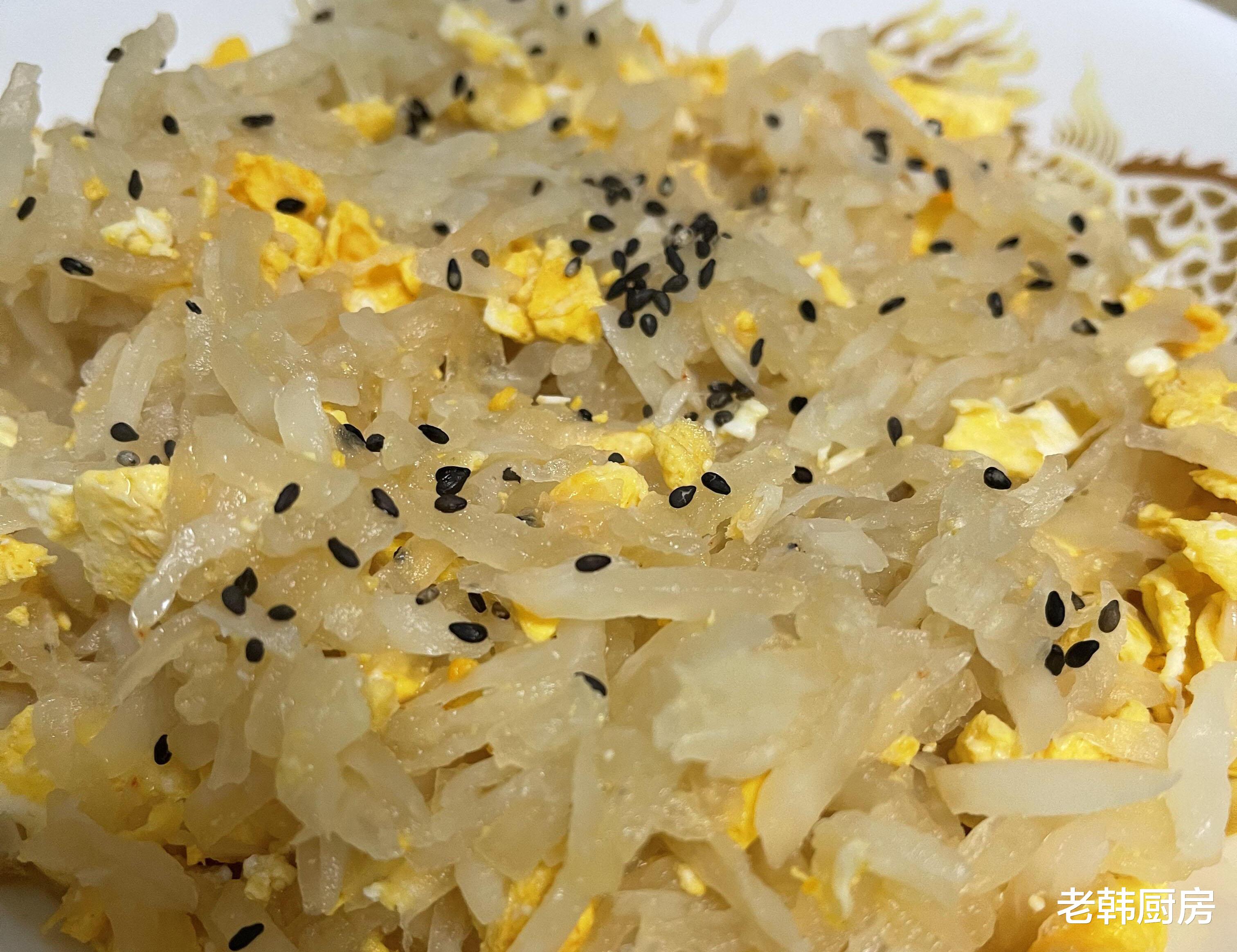 4、取出八角,放一点点酱油翻炒片刻,放虾皮、鸡蛋,炒匀出锅撒黑芝麻。