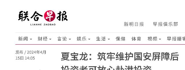 联合早报:2024-04-15《夏宝龙:筑牢维护国安屏障后 投资者可放心赴港投资》