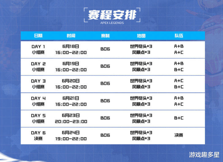 本届梦想杯赛事分为A、B、C三组,每组队伍将进行BO6的循环赛。经过五天的激烈角逐,积分榜前20名的队伍将有机会晋级决赛。届时,胜出的队伍将有机会分享高额赛事奖金,并赢得参加更高级别Apex赛事的宝贵机会。由于小组赛采用总分制,各参赛队伍在比赛初期便需全力以赴,展现自己的最高水平。并且循环赛会在一周的时间内打完,需要选手保持极高的状态。