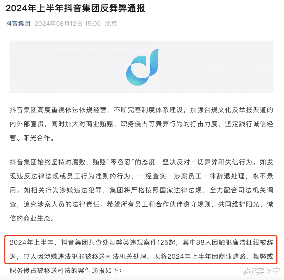此前抖音、美团等互联网大厂也曾相继发布年度、半年度反舞弊通报。其中,抖音集团上半年共查处舞弊类违规案件125起,其中88人因触犯廉洁红线被辞退,17人因涉嫌违法犯罪被移送司法机关处理。