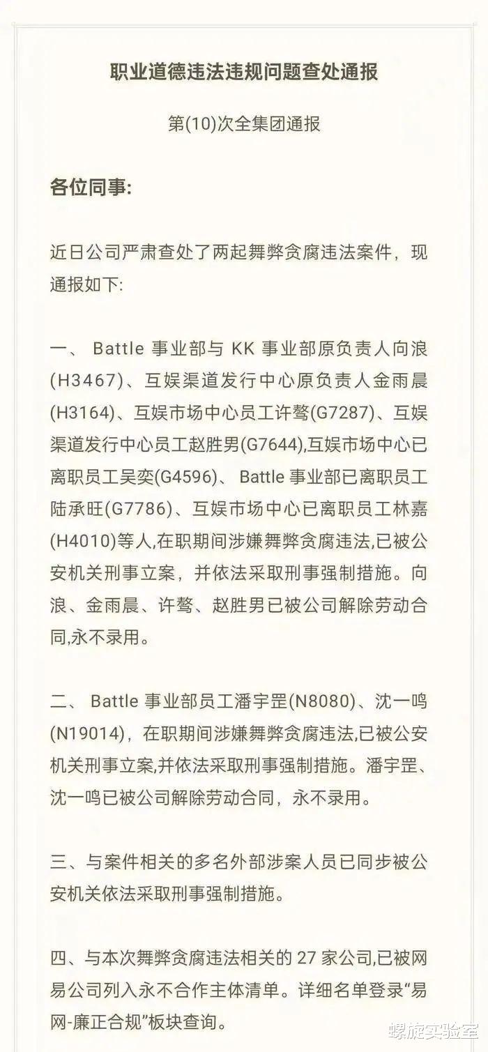 同天,网易内部发布邮件通报,针对“网易游戏高管贪腐风波”事件做出正式回应,本次经查出的网易内部舞弊贪腐事件有两起,6人被公司解除劳动合同,永不录用。此外,与本次舞弊贪腐违法相关的27家公司,网易将永不合作。
