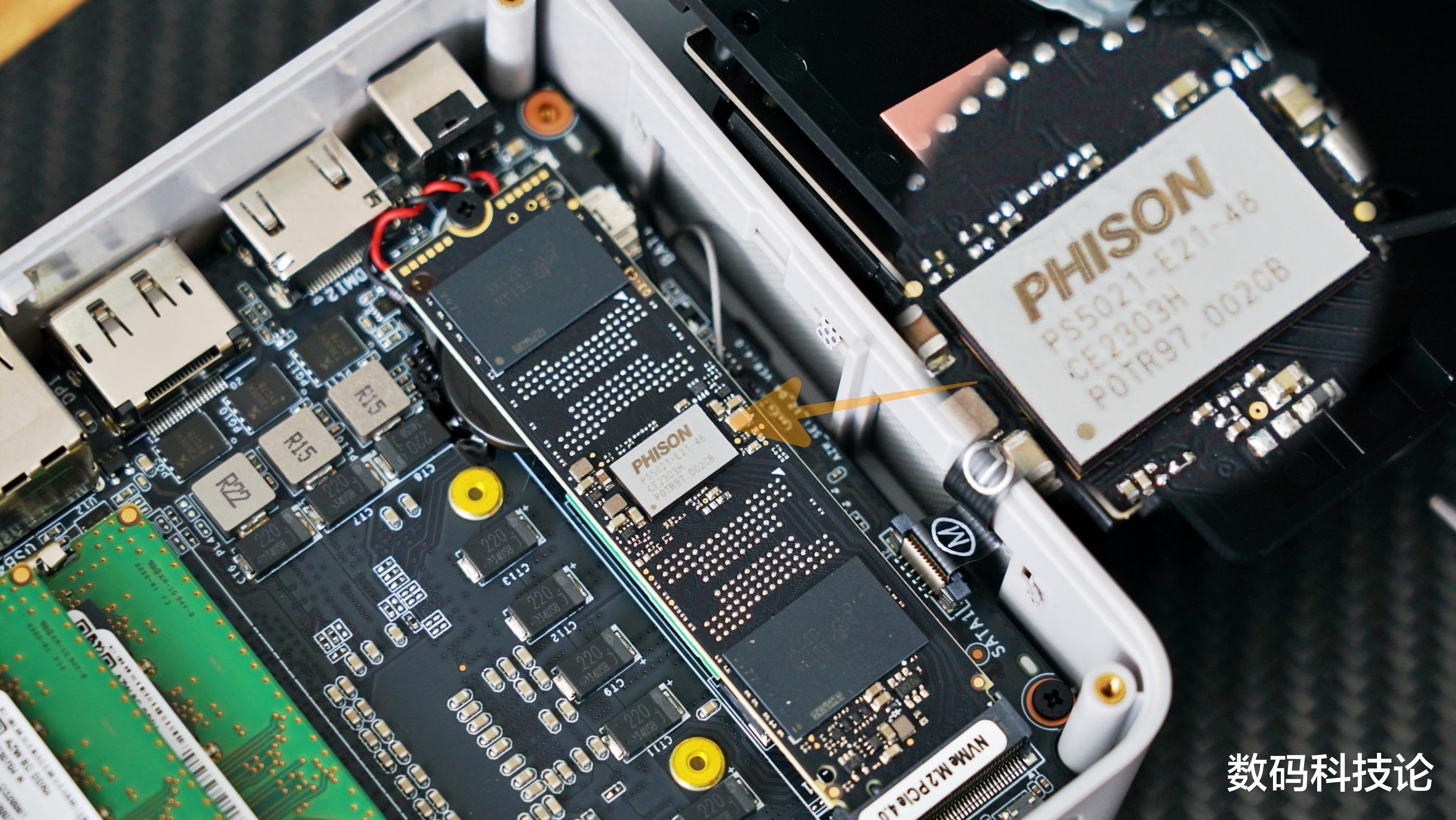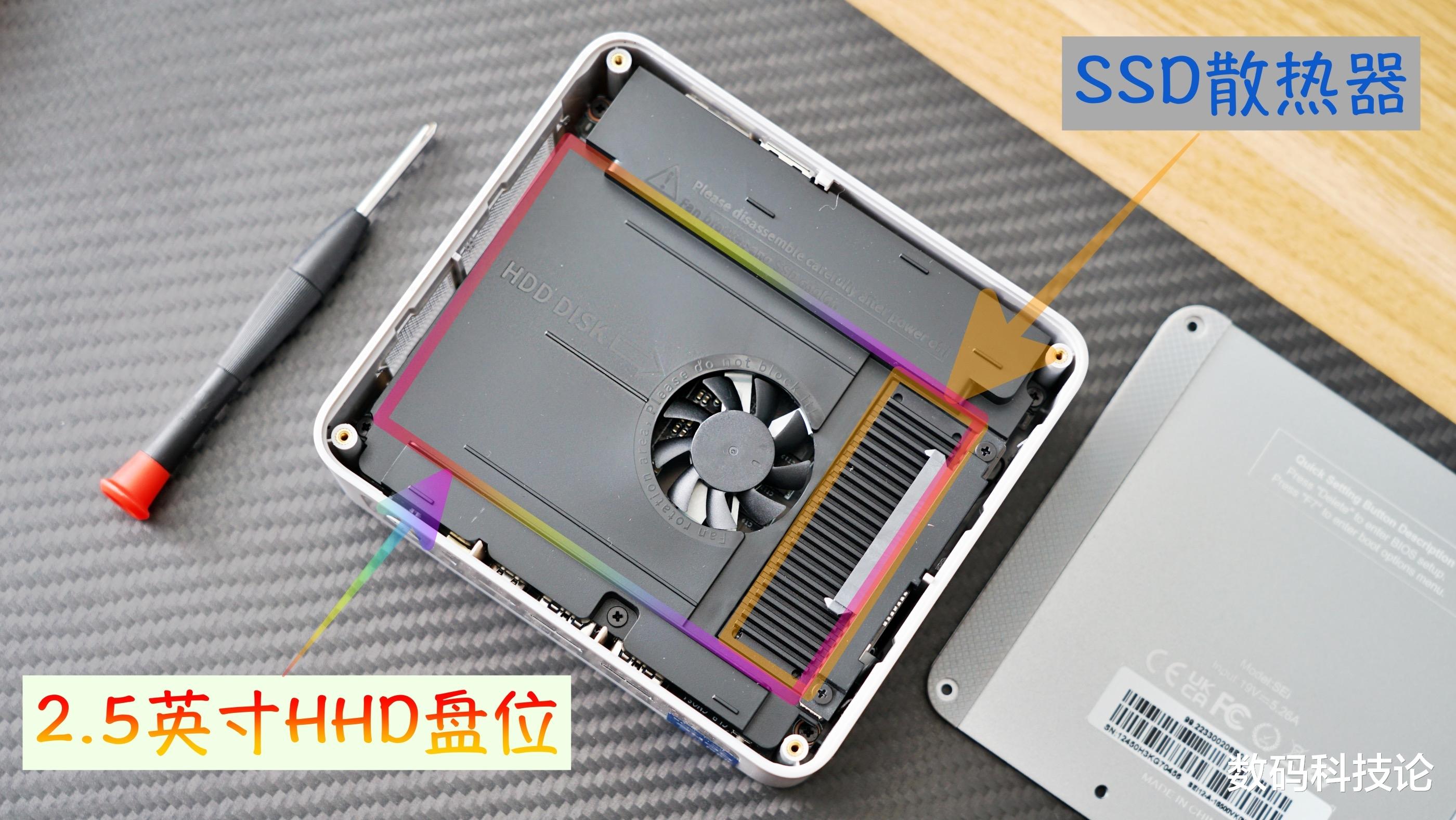 结构来看,背部也采用了改进后的新款零刻通用设计,增加了SSD金属散热器,并预留了2.5英寸HHD硬盘位,如果家里有老旧笔记本电脑硬盘也可拆出来废物利用当这个小主机的内置存储盘哦!
