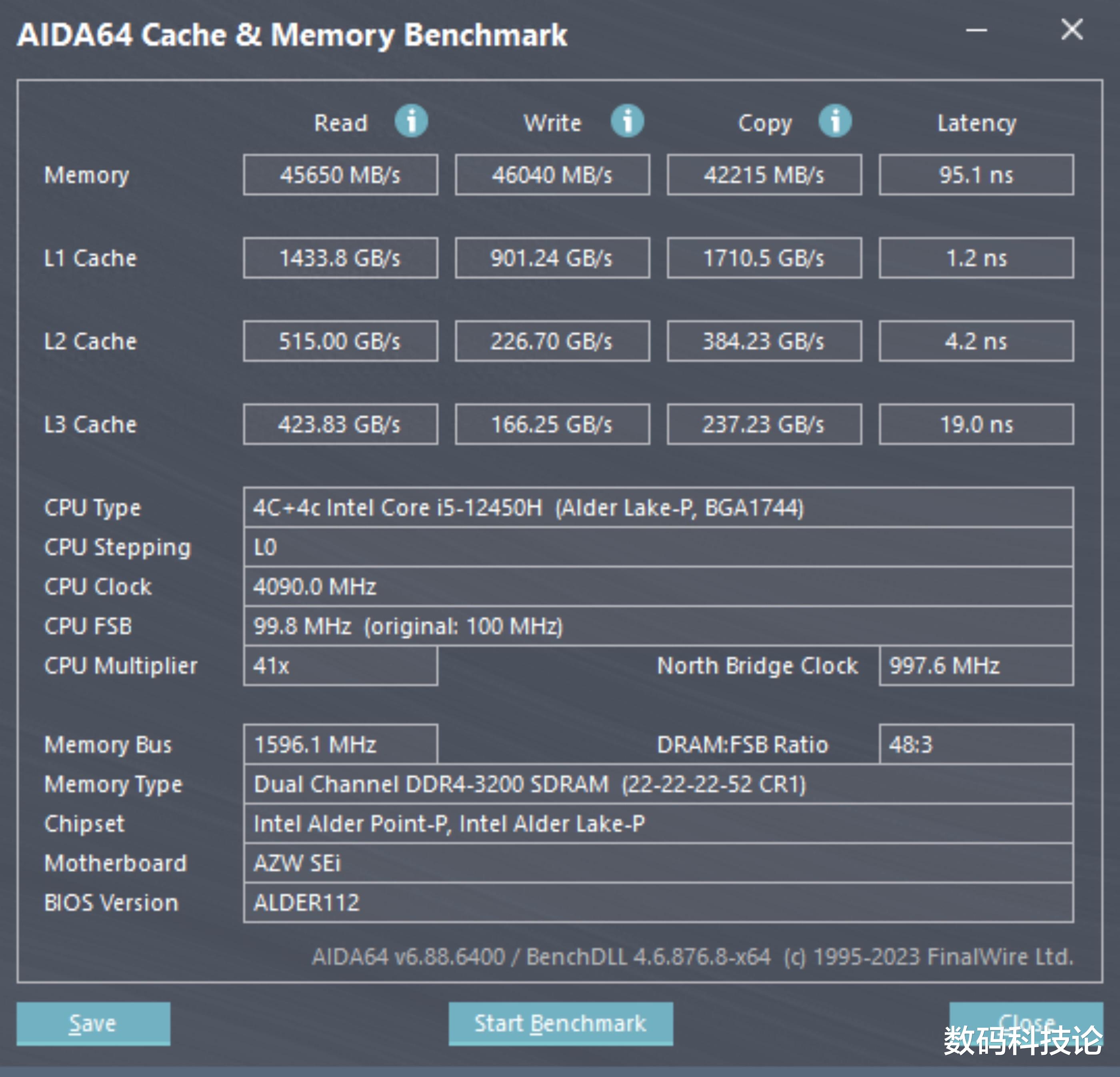 内存主频3200MHz,时序22-22-22-52 CR1,读写拷贝速度都在42~46GB/s的水平,延迟95.1ns。