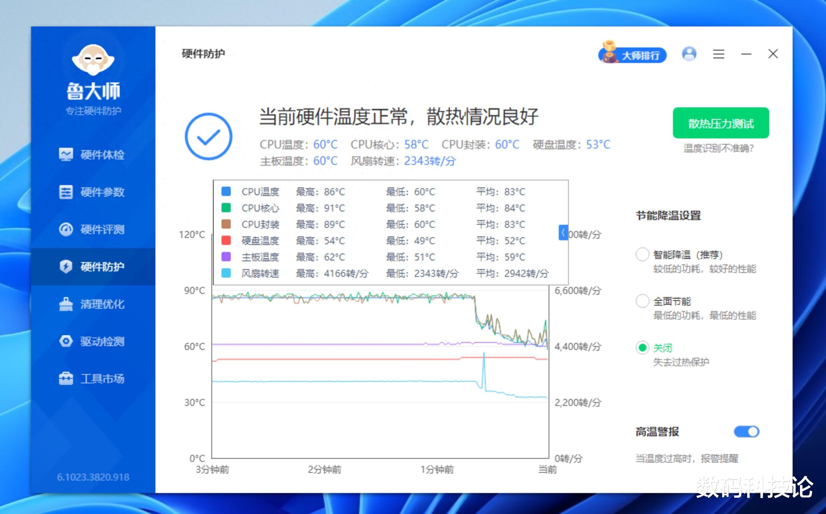 另外小主机的散热也是很多人关心的,相比一些商务本和轻薄本,开启鲁大师跑分不超3分钟就高温警报。这款主机还是挺能打的,我测试了6分钟,所有温度曲线都看不到热累积了才停止测试,但整体控温还行哦。