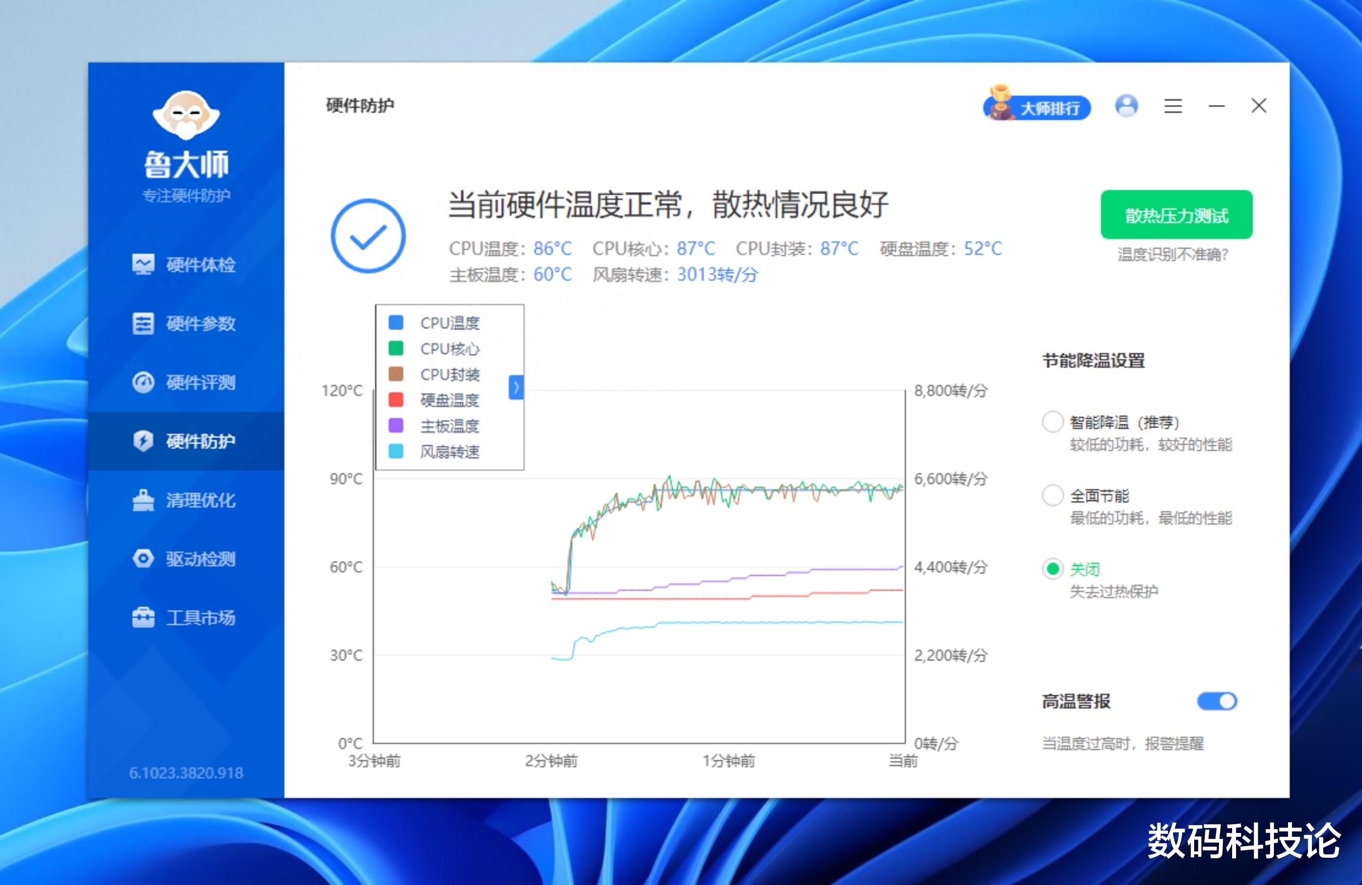 CPU温度最高86度、平均83度,硬盘最高54度,平均52度,主板最高62度平均59度。其中主板和硬盘高度关联,烤机的时候是能看到热累积的温度上升的;但6分钟之后热平衡了,这也就是意味着高负荷运转,也仅仅是主机温度略高,不会一直飙升,控温还不错,这比很多商用笔记本要好哦!