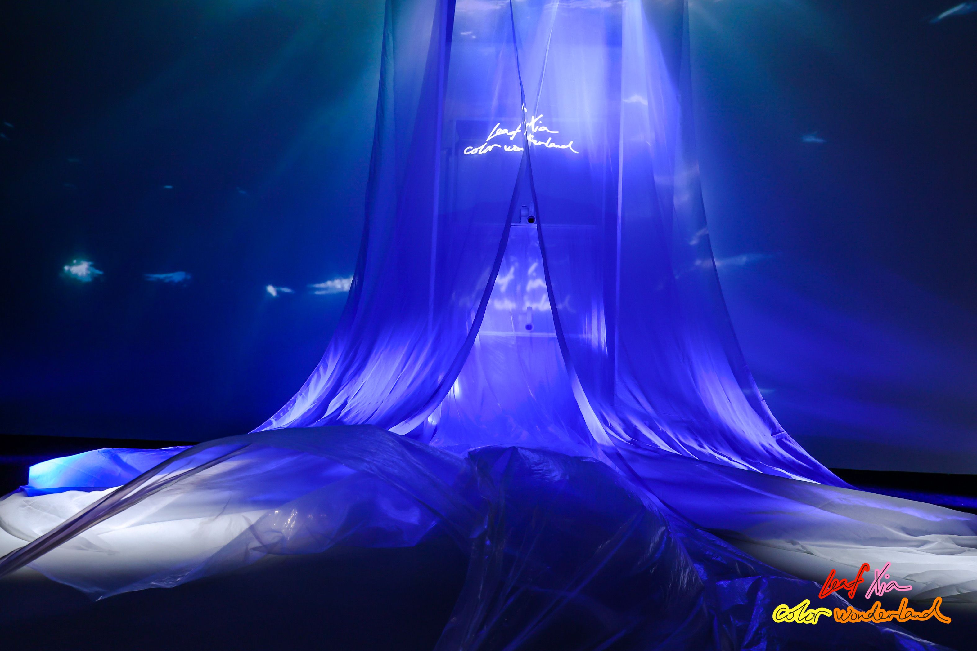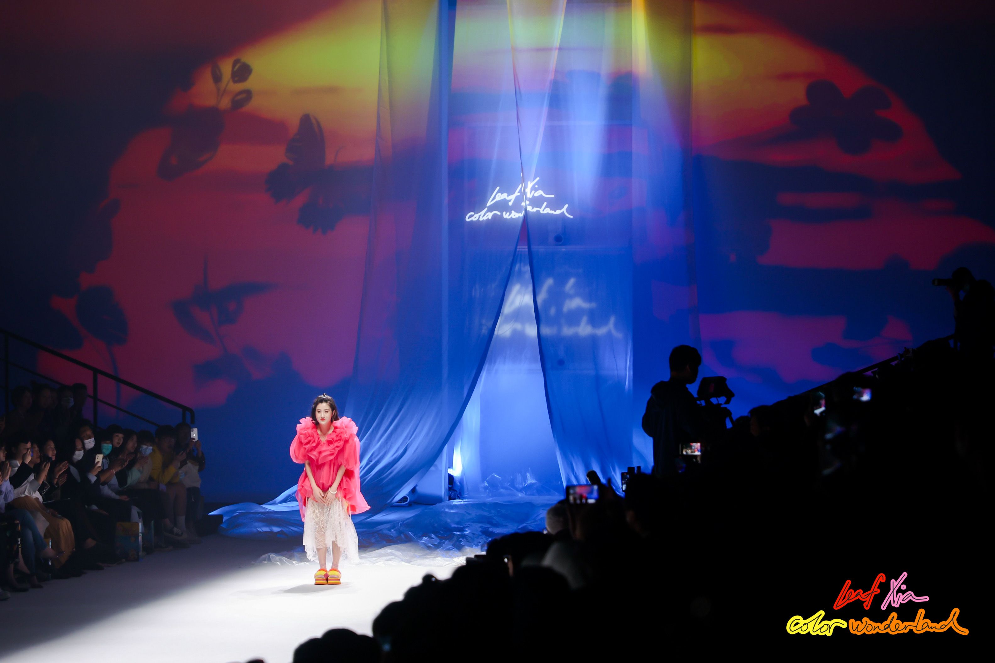 秀场舞美这季将秀场置于海洋中,用生物可降解塑料膜营造出海浪翻涌的奇幻景象,将内心随着秀场的音乐沉浸到海底童话世界中。海是倒过来的天空,海水诉说着日出、黄昏以及城市的故事,在生活中,面对大海的怒潮、汹涌与沉寂,然而每个人内心都存有一朵玫瑰,在规则面前探索生命的广袤与浪漫。期望着,享受每次迎接自己命运中风浪的过程,平波水面狂澜暗藏,生命却是寂静浪漫而又力量。蝴蝶、花朵、钻石等浪漫印花元素,被投射在观众席上,光晕保留了大海的一片蓝,营造出身处海底童话世界的幻象,带领着观众走进Leaf Xia colorwonderland构建的冬日梦境中。精灵们从透明的光束中缓缓地走出来,带有一丝梦幻和飘渺的气息,蓝色的波光交织着浪漫的舞美灯光,影射在模特身上,幻境式的空间承载了这一季的浪漫与自由,更是呼吁着保护海洋与自然。