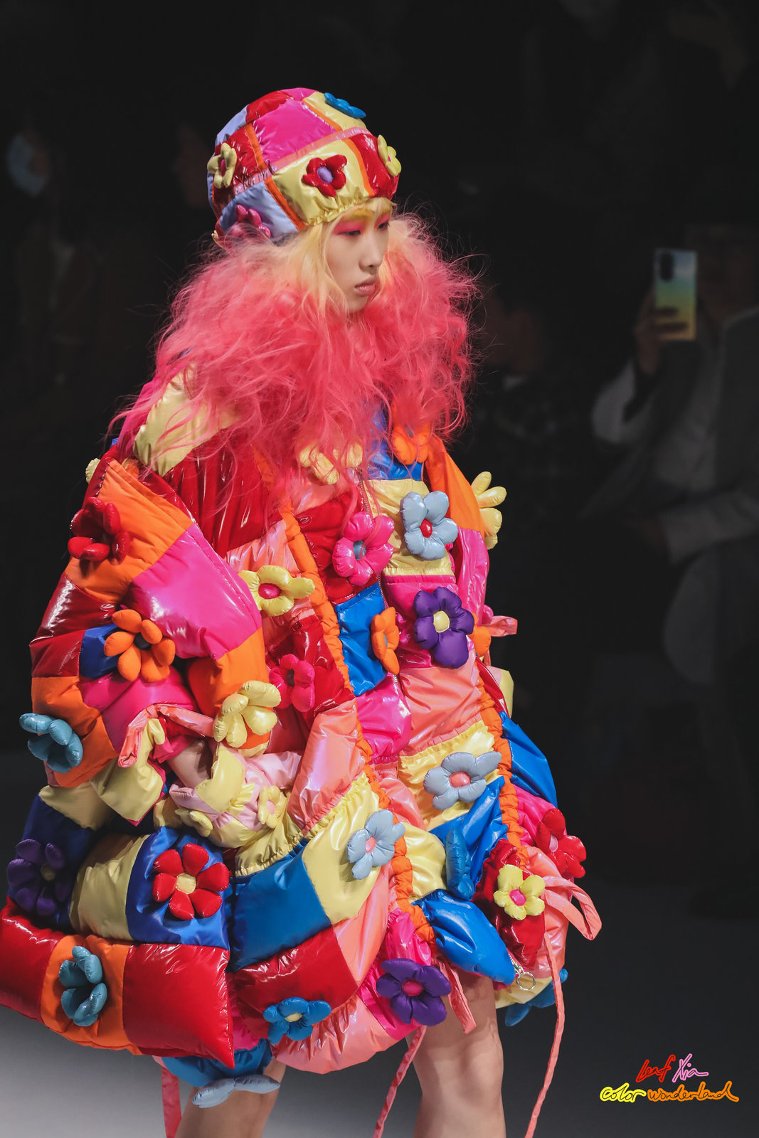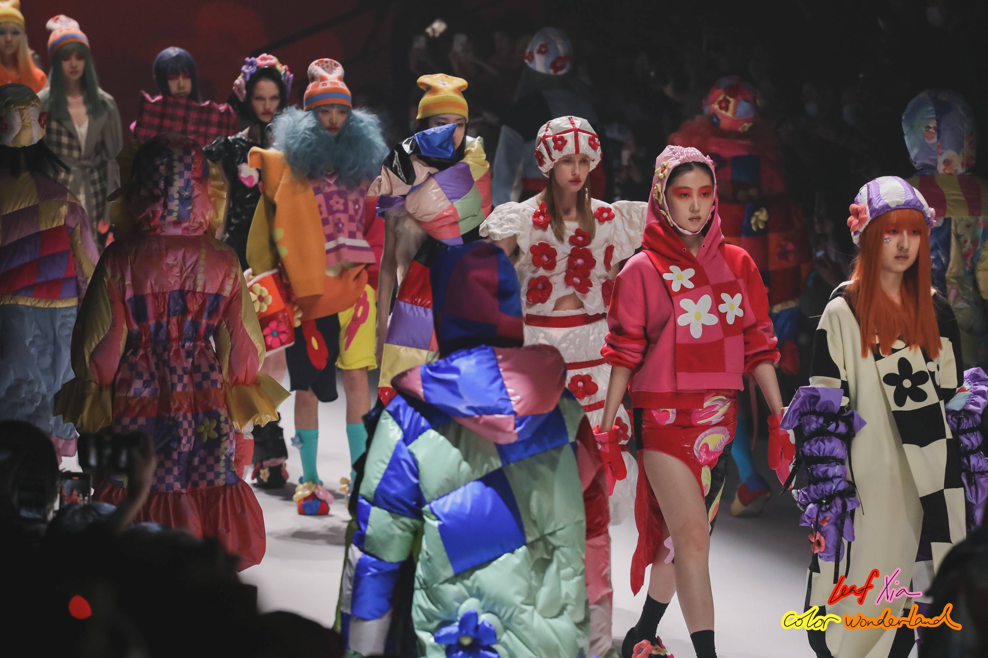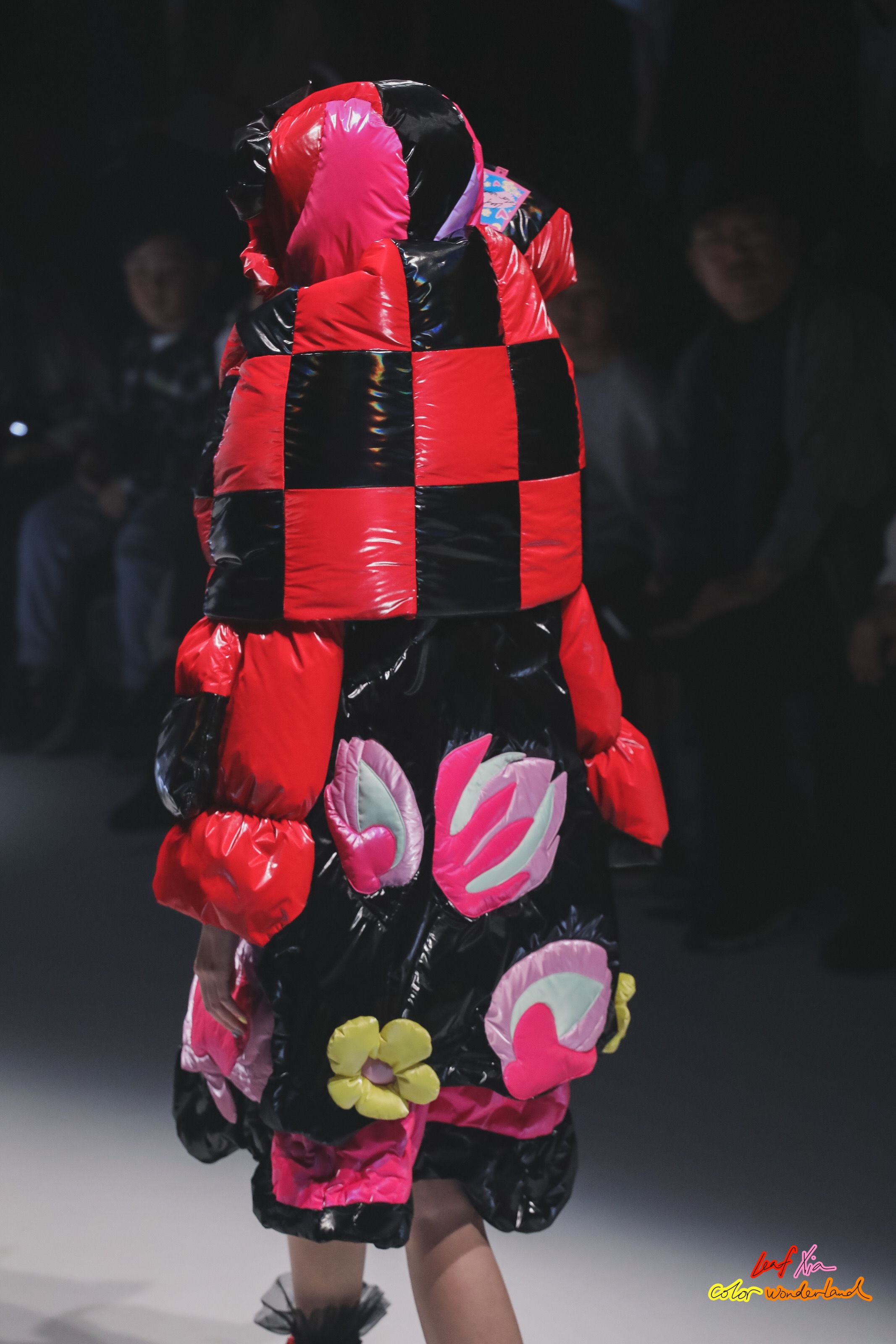 秀场直击本季主要专注在羽绒设计、毛绒、卫衣等冬季创意的可能性,元素拼接,纯色棋盘撞色,手工的编织,面料肌理再造呈现的裂纹等工艺倾述了这一季的浪漫,秀上的包包,帽子,手套,鞋子,发饰等一切都改造于本季的废弃面料,融入可持续发展的设计理念。印花、规则与不规则的图形被设计师肆意点缀在流动的羽绒行线上,尝试打破面料结构,与社会规则的束缚,来构建一个趣味浪漫而具有流动空间感的世界,赋予这一季更多意料之外的可能性和实用价值。设计师Leaf尝试通过复杂编织布料呈现出“动”态的浪漫与反抗的力量,绚烂的色彩包裹在充满空气感的立体印花上,企图打破冬装的固定规则,强调服装层次感之余,更凸显自由与束缚、浪漫与规则的冲突感。以立体缤纷的花朵绽放在极具色彩冲击力的光泽感面料上,是对规则化社会的浪漫反抗,本质上,完美阐释了Leaf在探索女性当下的身份认同时,从童话世界中汲取了浪漫主义精神,是一种关注女性内心的创作本心,从而完成对这个审美单一、价值趋同的现实世界的缜密思考。拼接技术被Leaf运用到了极致,采用不同颜色的涤纶面料拼凑,光感的、幻彩的,波光粼粼,像是阳光下爱丽丝梦游仙境的湖水,不同质感的色块对接,穿在女孩儿身上都化成了不设限的质感。抽象的廓形上,结合抽绳的设计,打破了冬季的单一,拥有了更多的穿衣自由,赋予了童话般的趣味性,充盈的太阳花在衣服上自由的摇曳着,每个花朵都有自己灿烈的生命,它们都有自己生命的色彩,不受规则的束缚,只是自然随性地生长着而已。富有层次感的面料结构也在本季玩出了新花样,面料上叠加彩色的编织,抓住了这季的浪漫与不规则之美。设计师的标志性印花和褶皱,在本季演化出了更有想象性的空间感,采用编织的特殊手法,将充绒的面料编织成长条,色彩的强烈碰撞,打破生活的一成不变,编织着色彩的童话。不禁让人想到刘易斯·卡罗尔童话中的爱丽丝,不甘于受到世俗教条的安排,纵身一跃的童话世界为爱丽丝保留了自己的梦境。