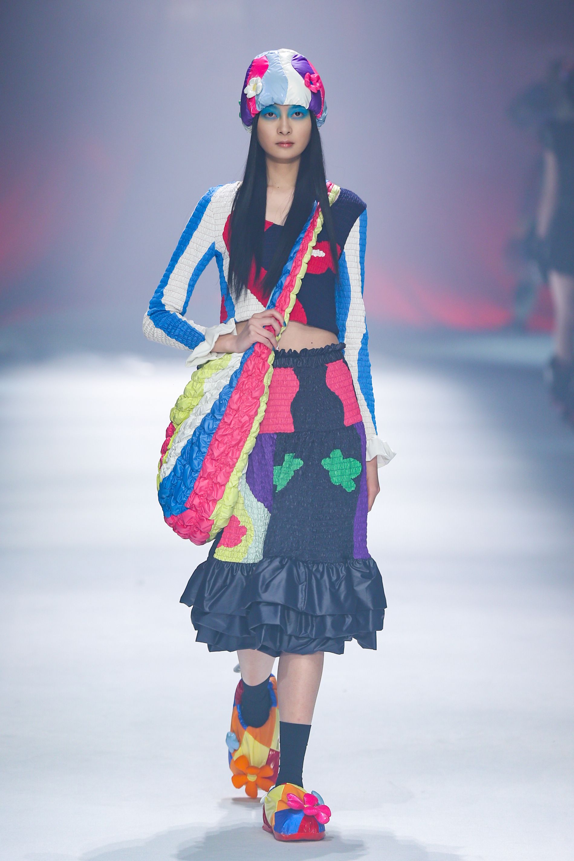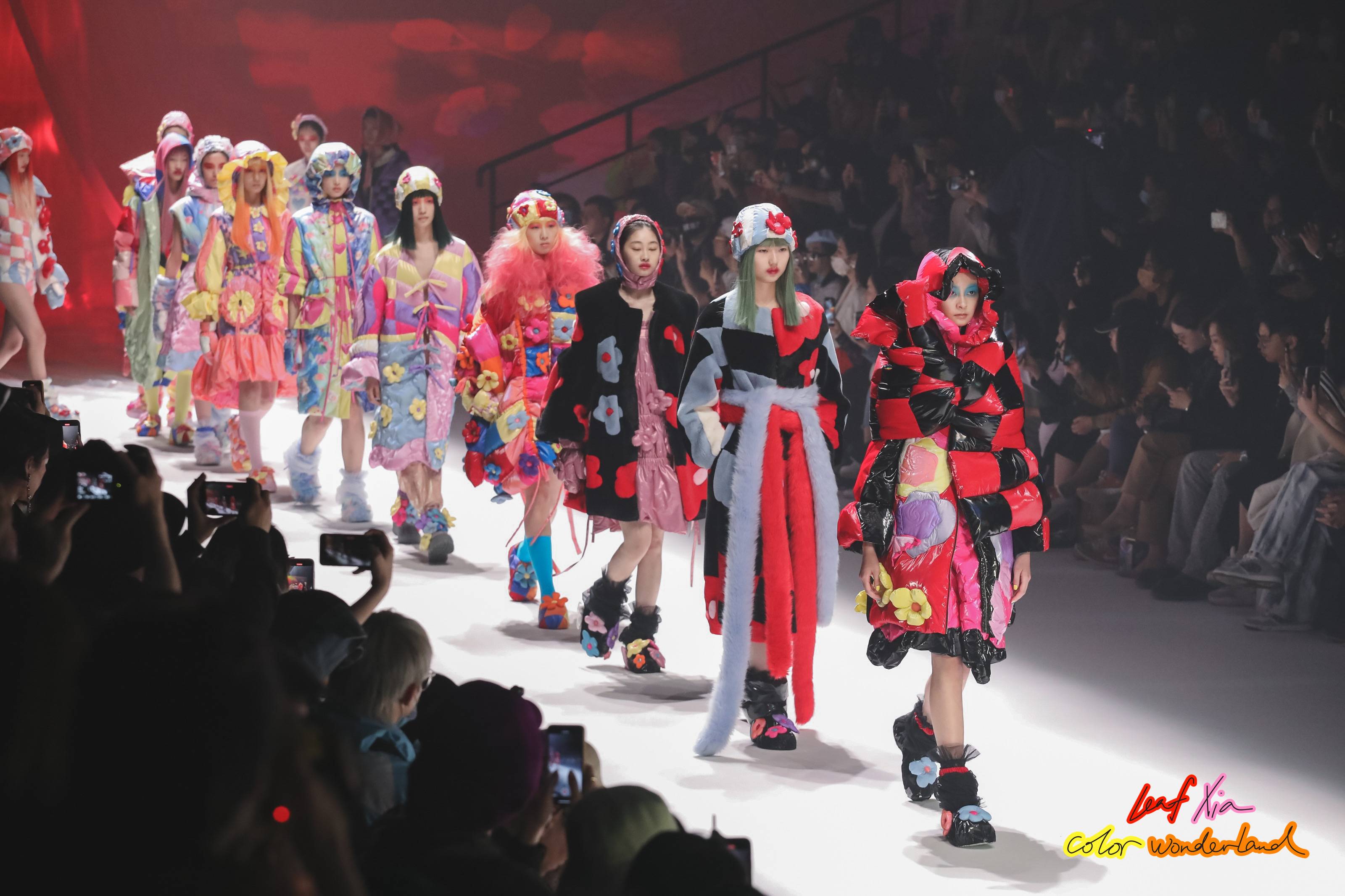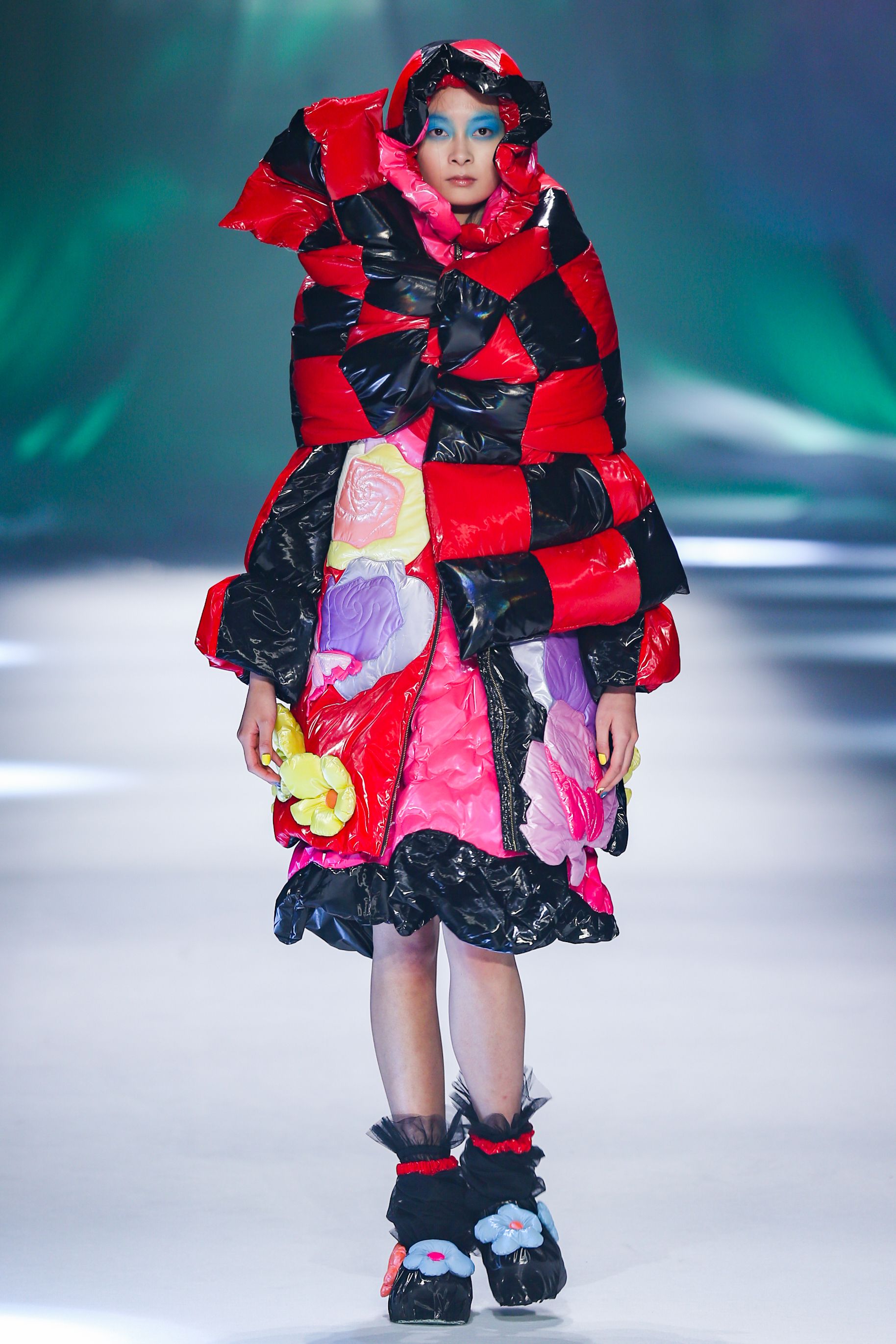 秀场直击本季主要专注在羽绒设计、毛绒、卫衣等冬季创意的可能性,元素拼接,纯色棋盘撞色,手工的编织,面料肌理再造呈现的裂纹等工艺倾述了这一季的浪漫,秀上的包包,帽子,手套,鞋子,发饰等一切都改造于本季的废弃面料,融入可持续发展的设计理念。印花、规则与不规则的图形被设计师肆意点缀在流动的羽绒行线上,尝试打破面料结构,与社会规则的束缚,来构建一个趣味浪漫而具有流动空间感的世界,赋予这一季更多意料之外的可能性和实用价值。设计师Leaf尝试通过复杂编织布料呈现出“动”态的浪漫与反抗的力量,绚烂的色彩包裹在充满空气感的立体印花上,企图打破冬装的固定规则,强调服装层次感之余,更凸显自由与束缚、浪漫与规则的冲突感。以立体缤纷的花朵绽放在极具色彩冲击力的光泽感面料上,是对规则化社会的浪漫反抗,本质上,完美阐释了Leaf在探索女性当下的身份认同时,从童话世界中汲取了浪漫主义精神,是一种关注女性内心的创作本心,从而完成对这个审美单一、价值趋同的现实世界的缜密思考。拼接技术被Leaf运用到了极致,采用不同颜色的涤纶面料拼凑,光感的、幻彩的,波光粼粼,像是阳光下爱丽丝梦游仙境的湖水,不同质感的色块对接,穿在女孩儿身上都化成了不设限的质感。抽象的廓形上,结合抽绳的设计,打破了冬季的单一,拥有了更多的穿衣自由,赋予了童话般的趣味性,充盈的太阳花在衣服上自由的摇曳着,每个花朵都有自己灿烈的生命,它们都有自己生命的色彩,不受规则的束缚,只是自然随性地生长着而已。富有层次感的面料结构也在本季玩出了新花样,面料上叠加彩色的编织,抓住了这季的浪漫与不规则之美。设计师的标志性印花和褶皱,在本季演化出了更有想象性的空间感,采用编织的特殊手法,将充绒的面料编织成长条,色彩的强烈碰撞,打破生活的一成不变,编织着色彩的童话。不禁让人想到刘易斯·卡罗尔童话中的爱丽丝,不甘于受到世俗教条的安排,纵身一跃的童话世界为爱丽丝保留了自己的梦境。
