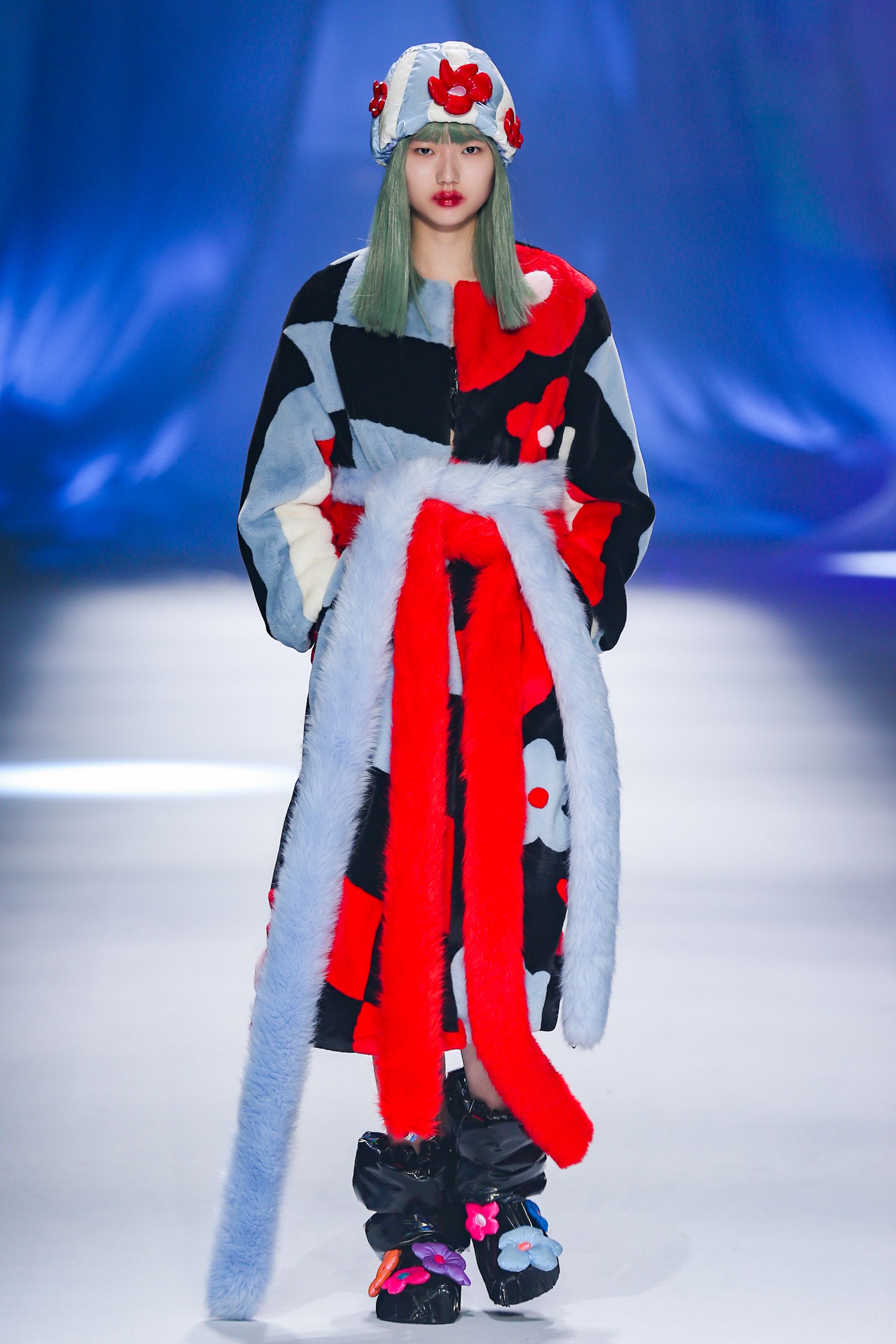 鞋帽及配饰极具趣味和实用的饰品,纯手工缝制的明艳色块拼接的花朵帽,色彩与褶皱线条拼接的羽绒袖套、腿套融合了独特的巧思,设计创意的鞋履,浪漫与舒适的气息舒展开来。秀款衣服重点设计描写1.橙黄色拼接针织帽簇拥着白色花朵,映衬着拼纱连衣裙编织的海洋童话的黄昏、落日与海面之下的神秘。 高领A字型连衣裙尝试打破冬日的约束,黑白纱织交错赋予了童话的虚幻与浪漫。不规则、流动感的图形,融合了红、蓝色系的拼接,整体造型更凸显了活力的生动。 蓝紫光泽感面料交错的靴子,覆以黑纱、珍珠元素像是浸入了最深的海底,鞋面上贴合的银色花朵,极具未来梦幻感。2.橙色宇航员帽子,化为勇气,打开了一段奇幻的故事。夸张的紫色、黑色和橙色拼接的充绒大围巾,舒适、温暖,让内心的柔软可以抵挡这个世界的荆棘。 紫色光泽感涤纶面料压印着本季的爱心、花朵元素,桔红色立体花朵盛开在露肩连衣裙的腰身,黑色抽褶设计营造了趣味的扭曲感。 黑紫色花朵棋盘拼接卫裤,脚下缤纷花朵的雪地靴,突破了冬季的想象。3.黑色与蓝色纱织拼接承载在光泽感的面料上,纵深流动的裁剪,像是海面随风起舞的波纹,突破了冬日对身体包裹的沉闷,重新发现了冬日童话带来了的流动感。 白色为底,青蓝色的波浪横纵交错,从花朵大头鞋上生长上去,中和了清冷的色系,透露出女性内心的力量。4.紫色、白色拼接的棋盘上漂浮着花朵,头顶波光粼粼的羽绒花朵太阳帽,黄色花朵大围巾,脚下簇拥着满满当当的花朵,来隐喻一种浪漫而细腻的女性生命力。