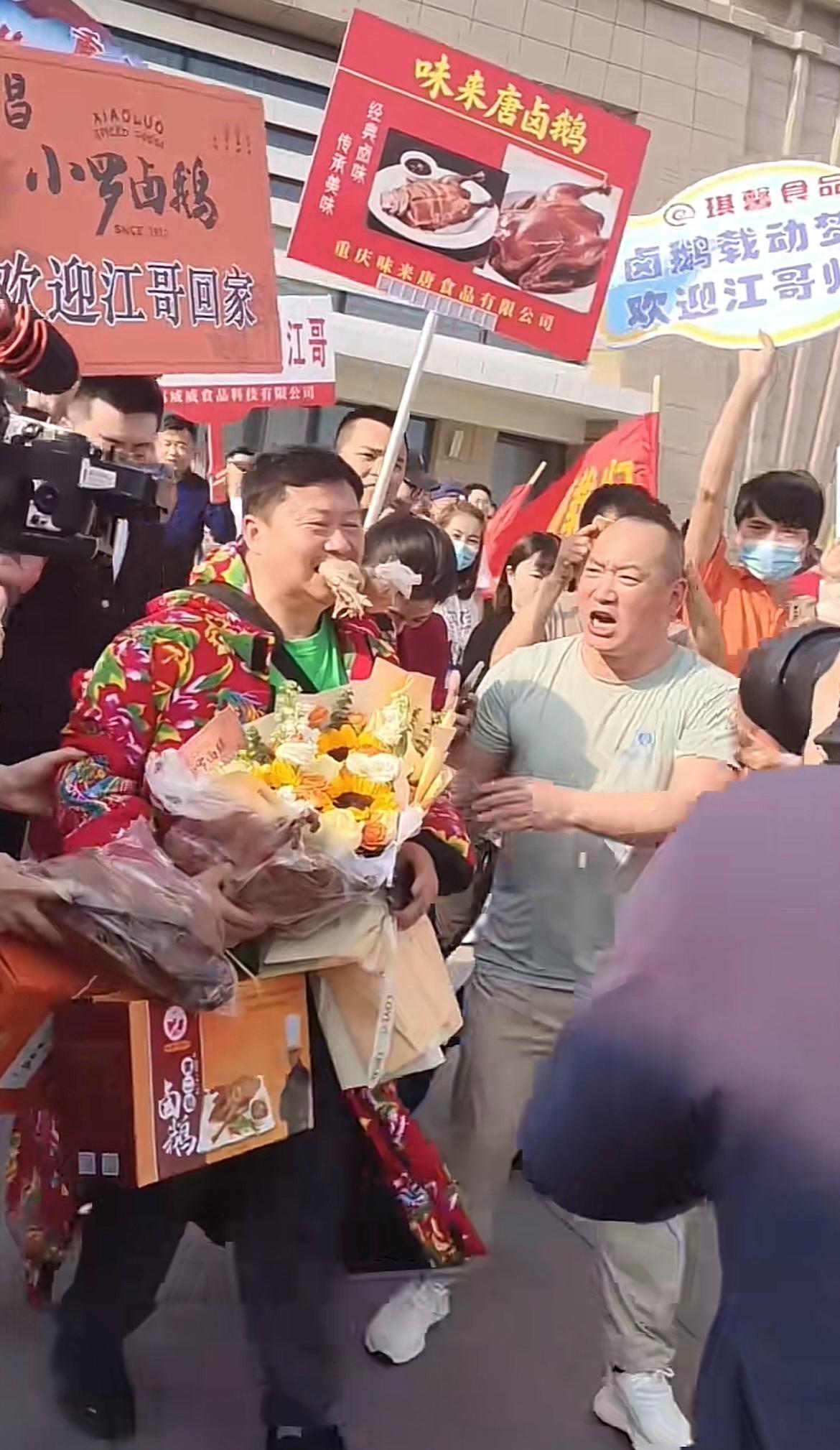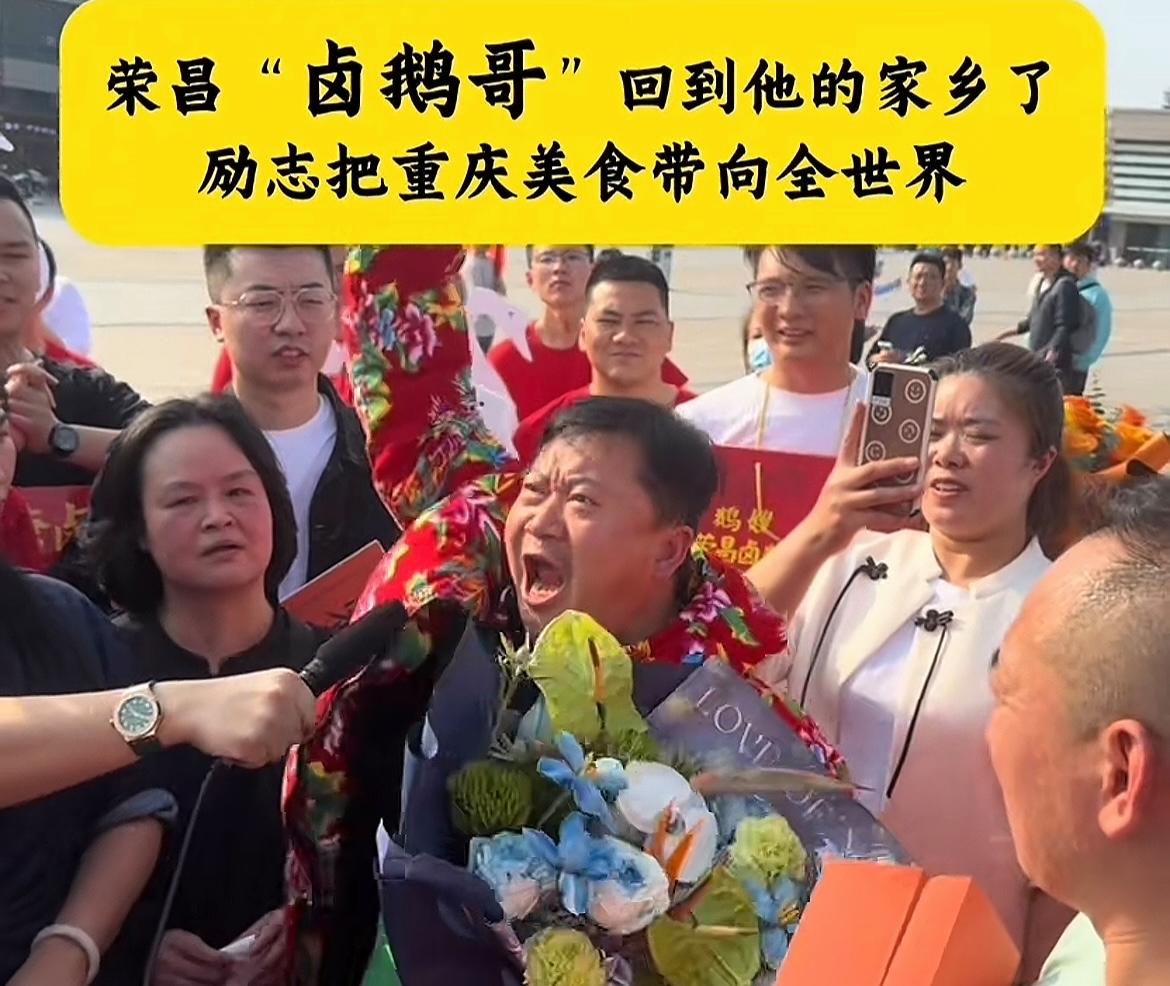 甲亢哥结束中国行程,从长沙离境,卤鹅哥回到重庆,卤鹅哥在荣昌高铁出站一刻,广场上已经有众多家乡父老,卤鹅商家,拉着横幅,手捧鲜花,媒体记者镜头等着卤鹅哥,那一刻我想卤鹅哥迎来了人生高光时刻,手里被送上啦鲜花,一堆媒体镜头对着他咔嚓拍,采访,嘴里被投喂美食,卤鹅哥说要把重庆美食推向全世界。