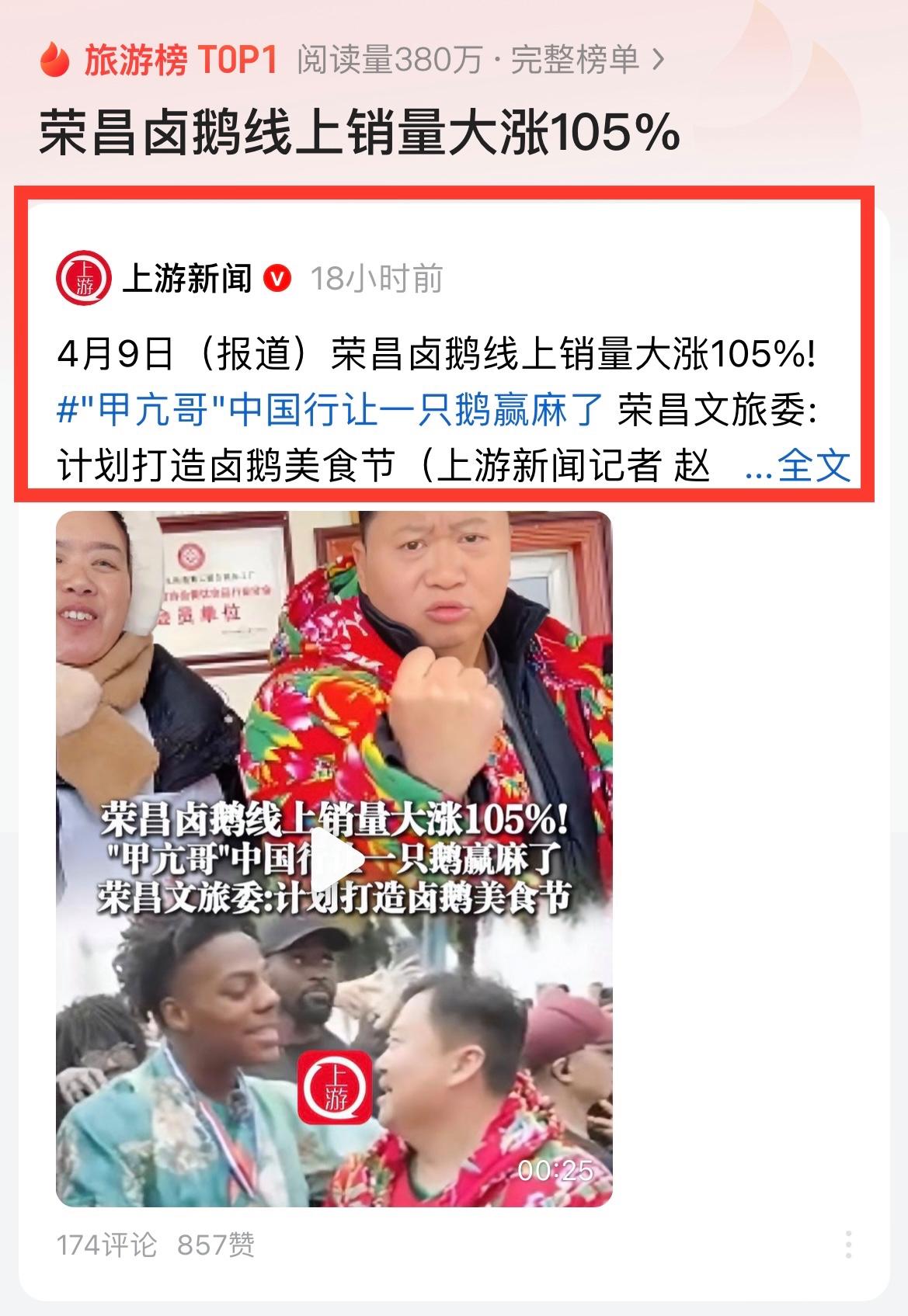 网友留言说:甲亢哥中国行在TikTok上有20亿点击,全球25%的人(中国以外)都知道荣昌卤鹅了。