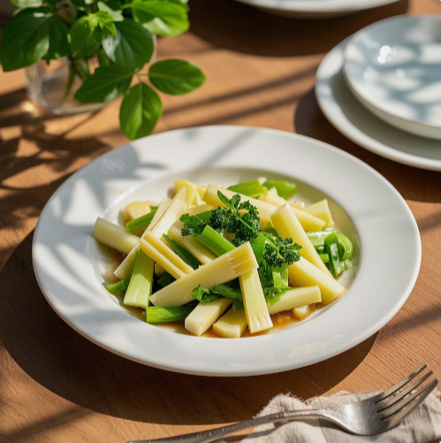 盛装时刻,这道翡翠春笋尖尽显精致时尚感。选用白色的简约餐盘盛装,将炒好的菜肴轻轻舀入,透过餐盘,可见春笋尖翠绿色的外衣,搭配一支精致的不锈钢餐叉,置于铺有淡色桌布、摆放着鲜花的餐桌上,宛如一件艺术品。夹一筷入口,先是春笋尖的脆嫩、接着是蔬菜汁带来的清新在舌尖交织,口感丰富,层次分明,每一口都仿佛吞咽下整个春日的蓬勃力量,清热化痰、益气和胃,开启活力满满的春日食光。无论是作为家庭聚餐的佳肴,还是日常犒赏自己的美味,翡翠春笋尖都能以其独特魅力让人陶醉其中,尽享春日养生之美。
