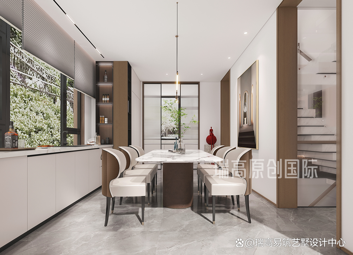 作为与厨房有着紧密联系的空间,设计师采用隐藏式推拉门,使两个空间更加灵活的联动在一起。作为需要大量储物的空间,利用柜子的材质造型装饰空间。简单的大理石材质的餐桌,金属支架。皮质的餐椅,这是材质的一次碰撞,是复杂的装置与极简设计的制约。化繁为简,化整为零,勾人心思,一探到底。