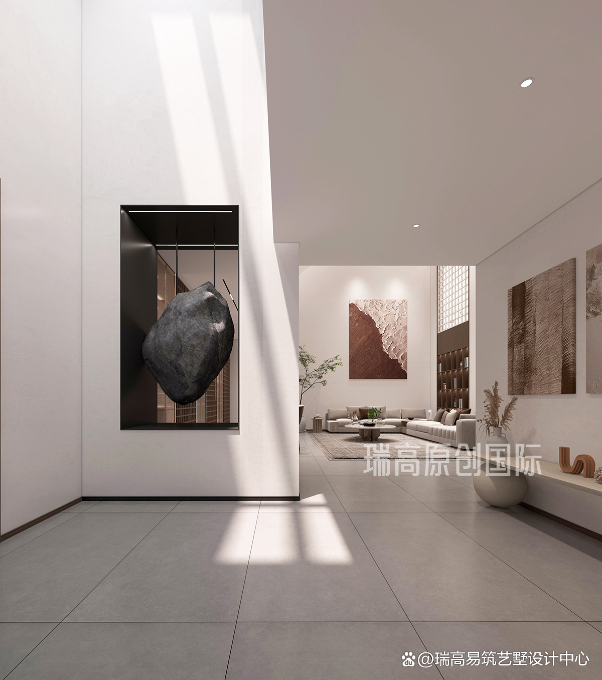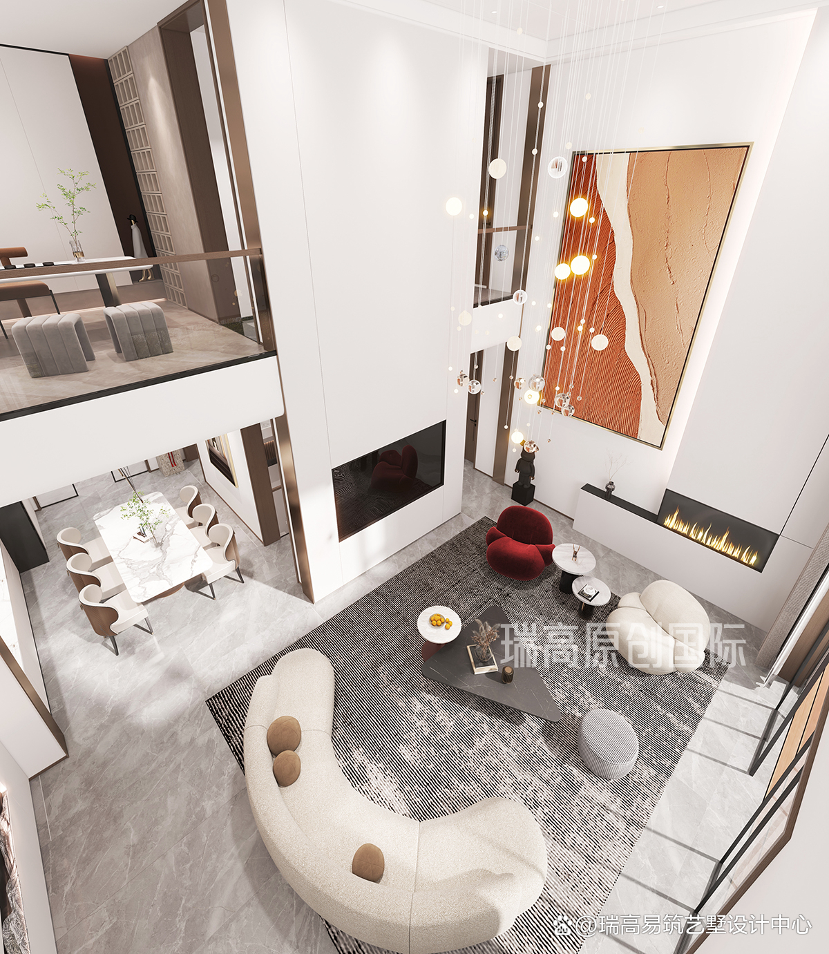 设计是表达居住者对品质要求最好的诠释方式,客厅是一个功能复杂的地方,圆弧形沙发从造型上更加别具一格,从空间上客厅区域稍窄较长,在保留足够动线空间同时也要凸显沙发的大气。是居住者的日常休闲,是客来客往的交际。在满足日常基本需求的同时,设计师更是对空间光感也有相当高的要求。壁炉是一个感性的装置,它的出现让室内出现了诗意与生气,细嗅品味生活即是艺术,一举一动都是艺术都是一幅幅画。空间上去除繁琐的装饰,利用空间高度、自然光线、灯光,从颜色、材质、软饰搭配上,保留了原建筑所表现的最本质的明朗阔达,大气优雅。运用极简的设计,表达最细腻的手法。