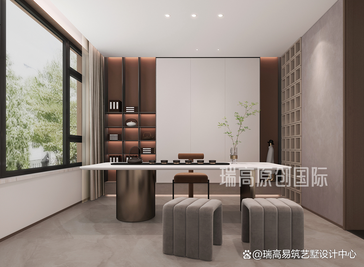 茶艺作为中国民族文化的特色。选茗、择水、烹茶、茶具、环境都有着极高的要求。品茗室以灰色为基调,加入花艺装置的点缀,结合极简的家具带入一点点的轻奢进入,搭配隐藏式灯带点亮整个空间。设计的灯光不用特别多、特别亮,只需要恰到好处的凸显空间的清纯、幽雅、质朴。原建筑窗户用水泥砖装饰,有中式园林窗景之感,书架错落有致,开与阖都有一番深意。