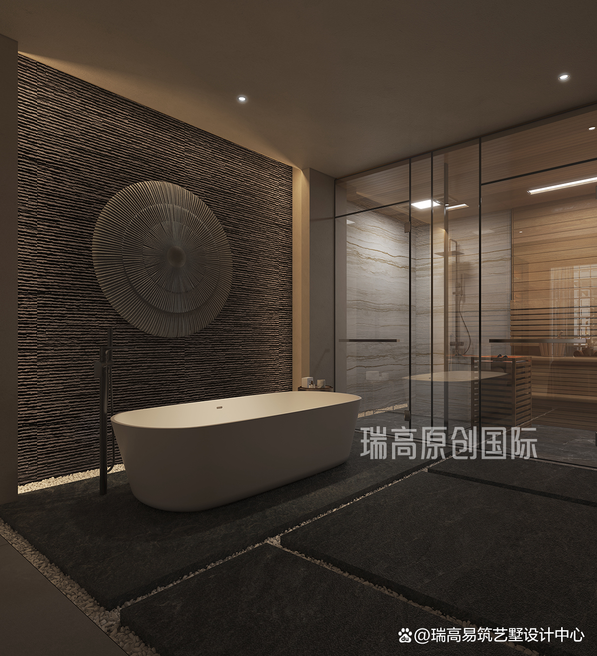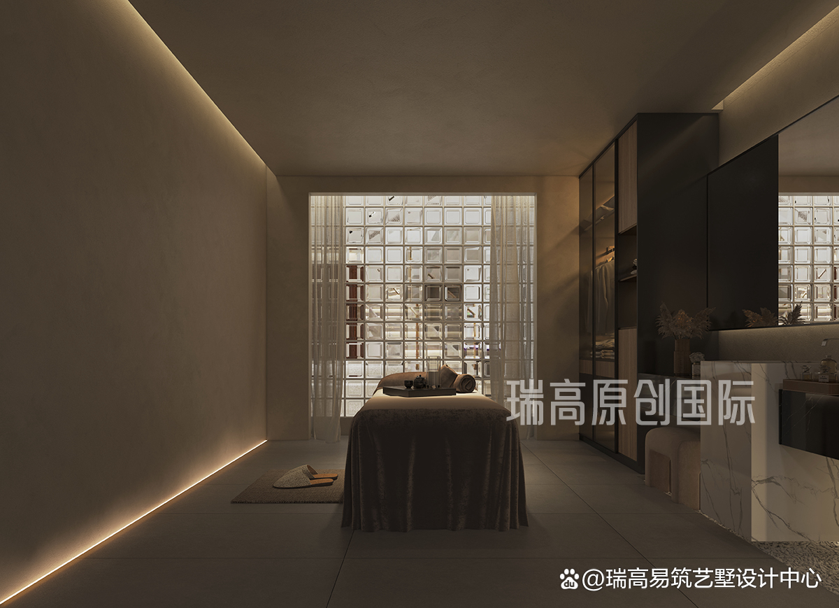 设计师在SPA区域内设施了桑拿间、淋浴区。功能上划分完整,设计上,入门错落层叠的背景墙,一点美式元素的艺术装置,左侧干区,右侧淋浴桑拿位置为湿区。灯光上,设计SPA间采用比较暗的效果,整体凸显空间私密性,在空间内更加舒适。