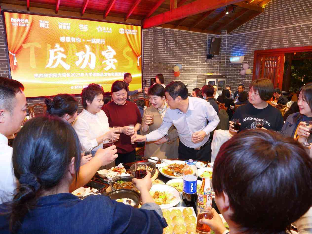 新品发布会结束后,一场盛大的庆功宴将活动推向高潮,一段气势磅礴的鼓舞,让全场热情高涨。大家高举酒杯,喊着 “阳光八点,让梦想充满阳光” 的口号,共庆盛会圆满成功。