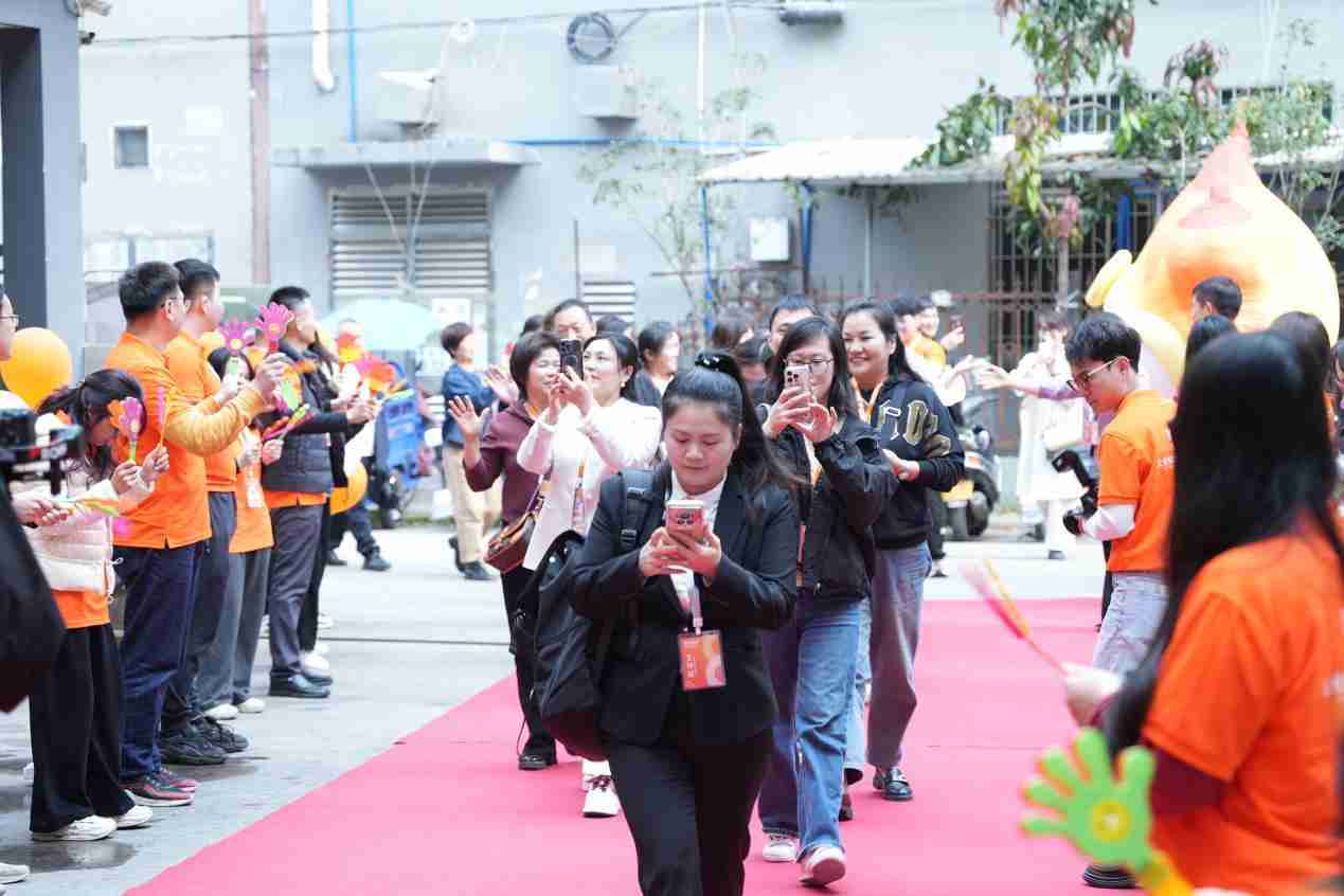 当经销商们抵达大门的那一刻,阳光箱包集团的热情便扑面而来。公司大门前,身着橙色 T 恤的同事们整齐列队,脸上洋溢着真诚的笑容,热烈欢迎每一位远道而来的家人们。