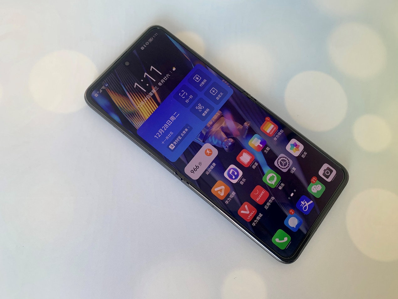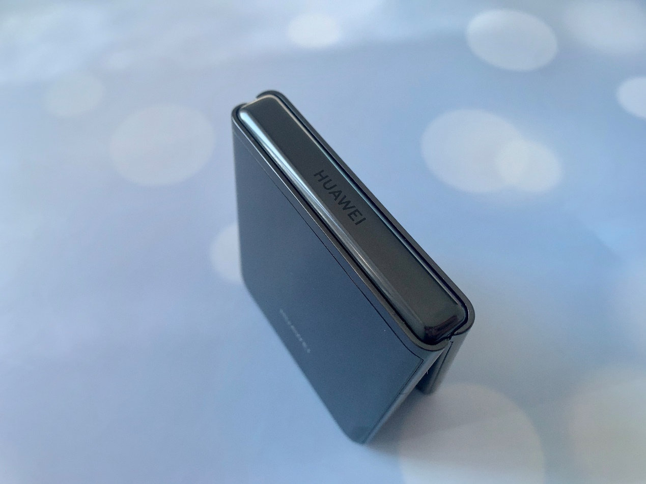 手机采用了上下折叠设计,使用了华为自家的水滴形铰链设计,既确保了折叠半径最大,还确保了折叠后合盖部分没有缝隙,手机折叠起来正如其名称“宝盒”一般,折叠之后的厚度有 15.2mm,展开之后的厚度只有 7.2mm,日常收纳携带非常方便,放在桌子上宛如一件工艺品。说到这里很多人会关心折痕问题,肯定不会没有,但是在展开使用时几乎感受不到,只有特定角度才比较明显,另外就是其不能任意角度折叠稍显遗憾,因为女性用户用来当化妆镜的幻想就破灭了。