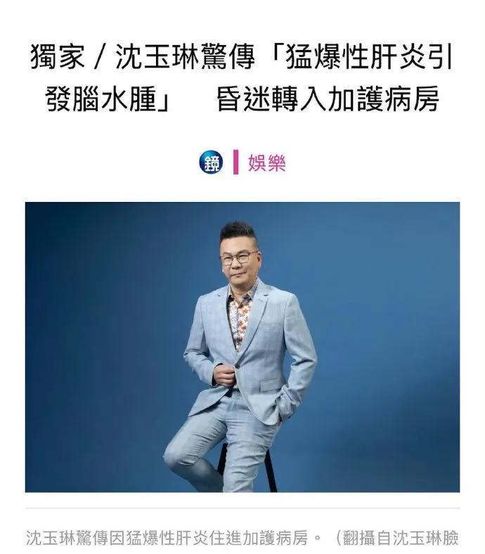 #曝沈玉琳因猛爆性肝炎引发脑水肿# 据台媒最新报道,沈玉琳入院是因猛爆性肝炎引发脑水肿,在医院挂急诊后被转入加护病房,目前意识不清……[苦涩][苦涩][苦涩] 而由他主持的节目《11点热炒店》本周确定暂停录制,记者在医院见到好友潘若迪在门诊外焦急等候,但他和沈玉琳妻子芽芽一样都没有回复媒体消息,保佑他!!!威廉沈!!! 一定要关关难过关关过[苦涩]
