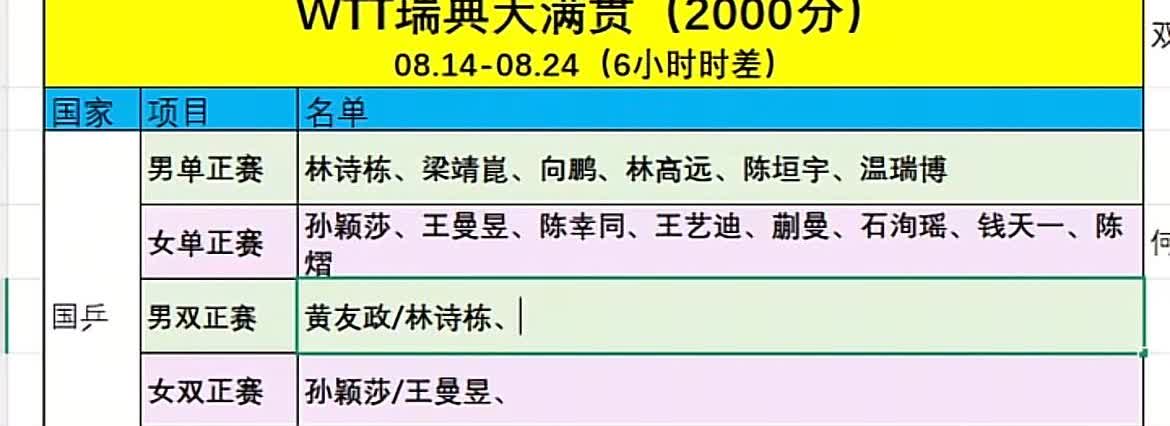 王楚钦为什么不参加WTT瑞典大满贯 中国队男单 王楚钦不参加。王楚钦是实际上的世界排名第一。王楚钦不参加外协雨果、张本智和他们应该很高兴。毕竟林诗栋打不过他们,王楚钦能打得过他们。为什么王楚钦不参加瑞典大满贯赛事呢? 瑞典大满贯中国队大概率拿不到男单冠军了。 林高远参加瑞典大满贯,希望高远取得好成绩。加油林高远! 向鹏参加。向鹏加油!希望向鹏打出好成绩。 所有国乒参赛选手中,只有小石头林诗栋身兼三项。 林诗栋参加男单 林诗栋黄友政参加男双 但是黄友政不参加男单只参加男双。可能是积分不够。 林诗栋蒯曼参加混双 蒯曼不参加女双。 女双是孙颖莎王曼昱。