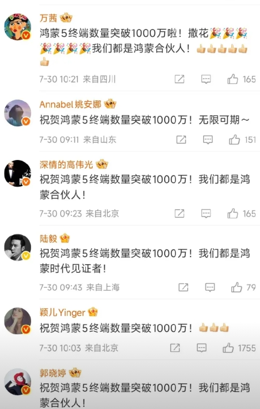 华为鸿蒙智行果然还是资源够强,这么多明星都来打卡转发了,有点意思啊。