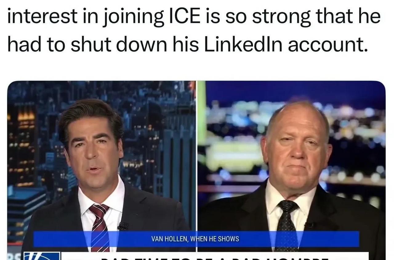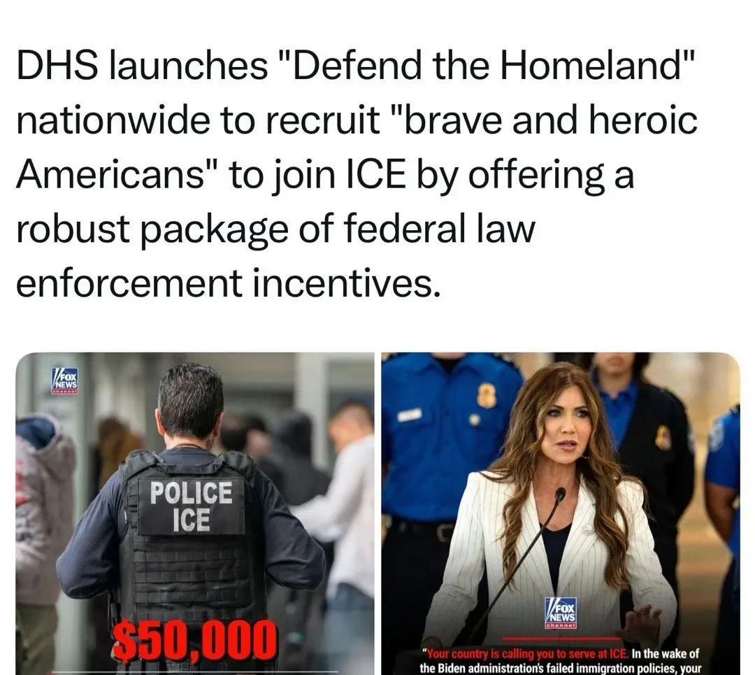 美国国土安全部发起“保卫祖国”招聘活动,移民执法员签约奖金五万美元 以为什么高新技术,签约奖金高达5万美元。原来不就是一个打手吗! 还冠名“保卫祖国”,其实就是打击非法移民。 打击驱逐非法移民,也被打造成一个产业,以至于趋之若鹜,不得不关闭LinkedIn账号。